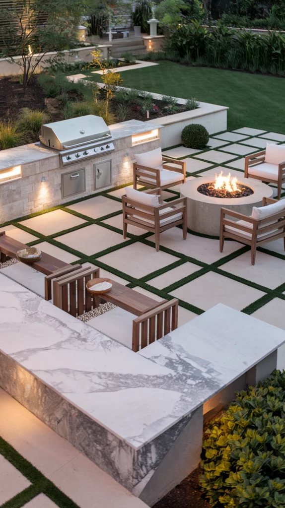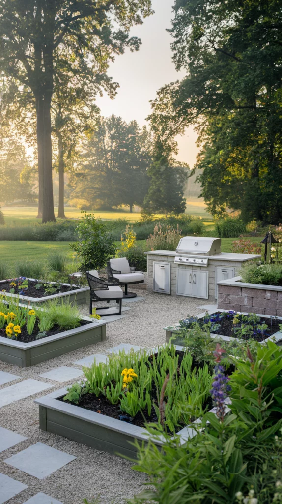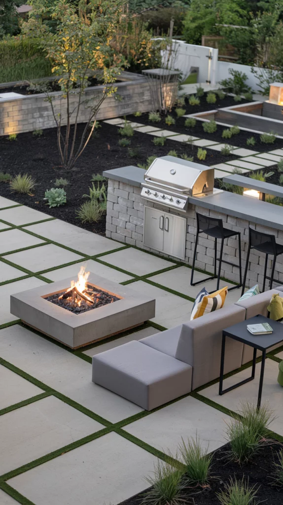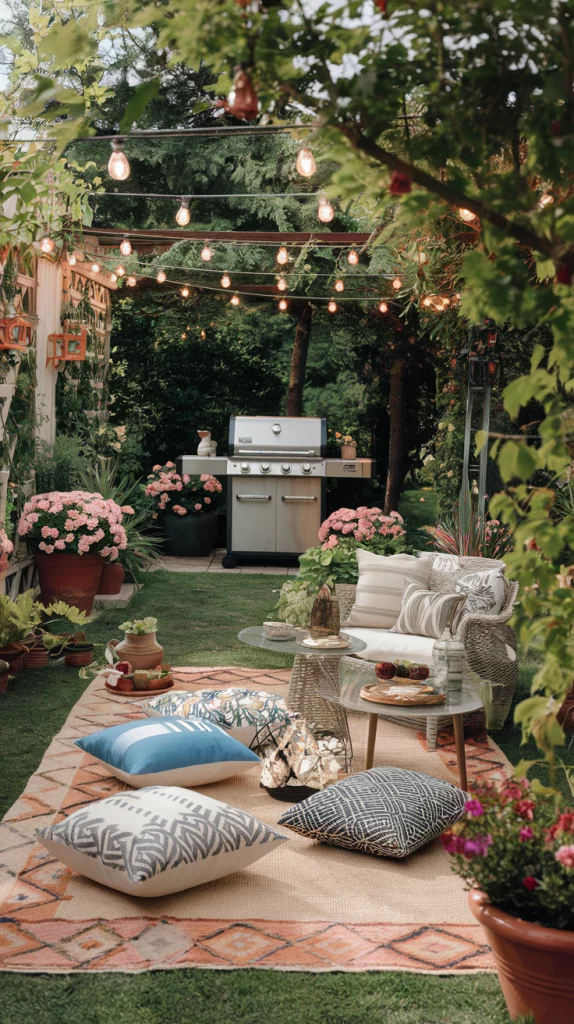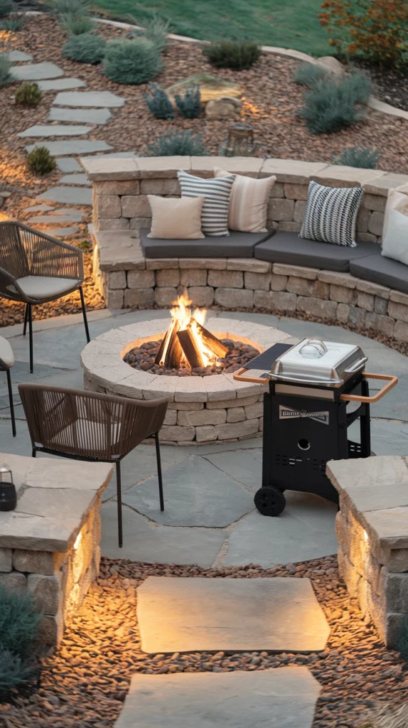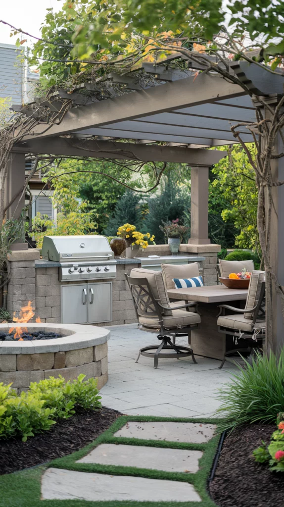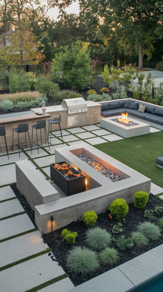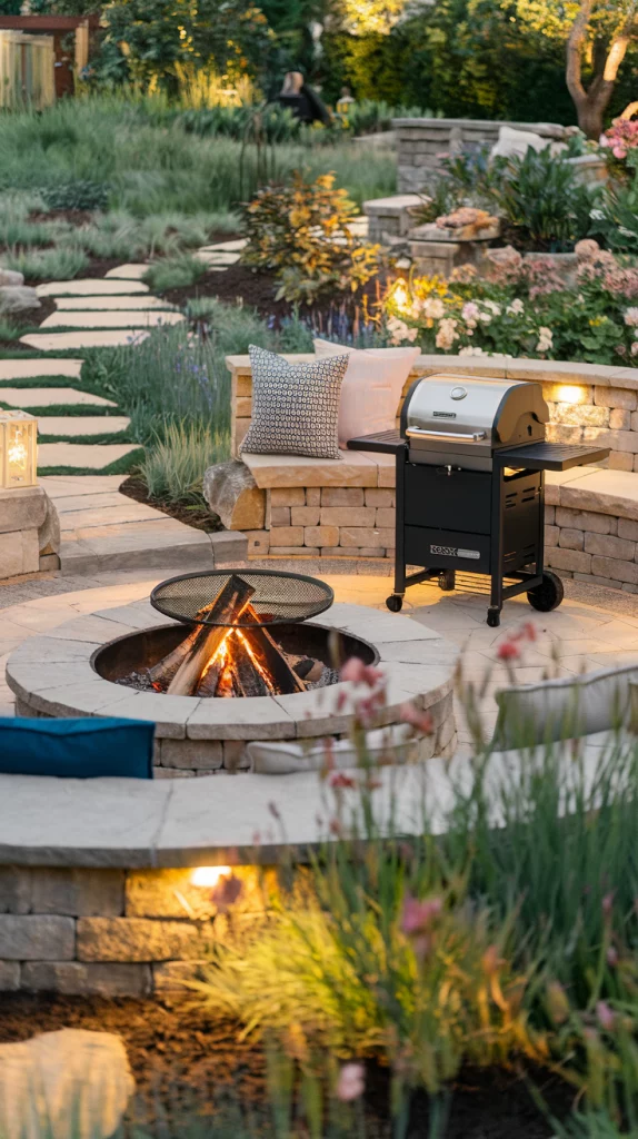 Firepit BBQ areas are perfect for creating a welcoming atmosphere. Surround a central firepit with stone seating or multi-functional furniture like benches with hidden storage. Opt for a portable grill to maintain flexibility. Add throw blankets and cushions for a cozy touch, making this area ideal for cooler evenings.