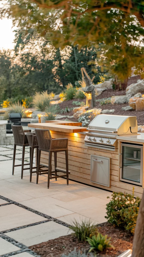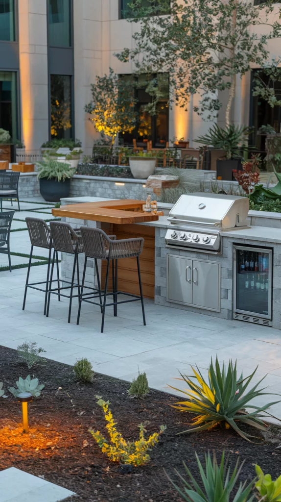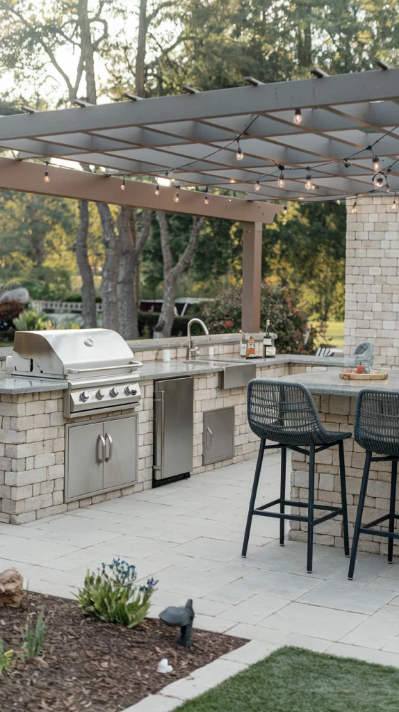 Take your outdoor BBQ area to the next level by transforming it into a full-fledged outdoor kitchen. Include essentials like a sink, refrigerator, and ample cabinetry for storage. Add a pergola for shade, string lights for ambiance, and a bar counter with stools for a complete entertaining experience.