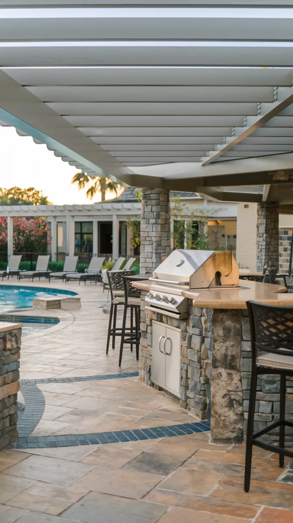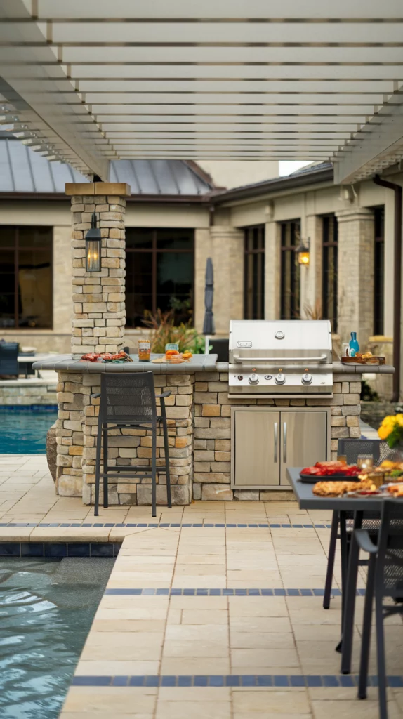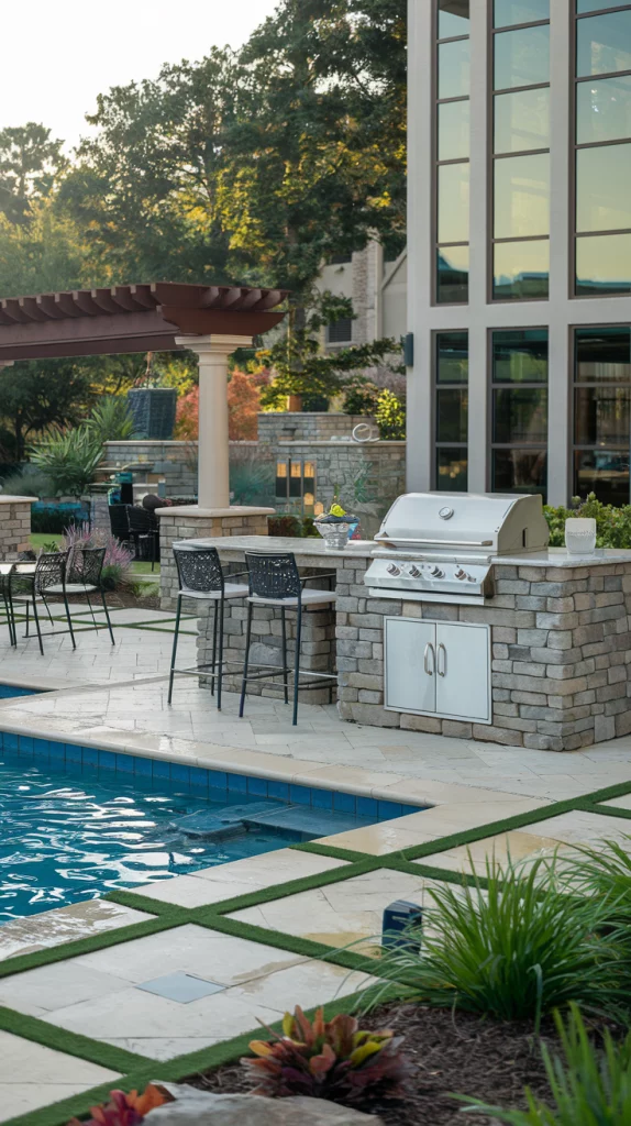 Combine your BBQ space with your poolside area for the ultimate outdoor entertainment hub. Place the BBQ station close enough for convenience but far enough to avoid smoke near the pool. Include bar seating and shade structures like umbrellas or pergolas. Durable materials like stone or tile ensure a seamless transition between the pool and the BBQ area.