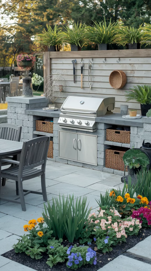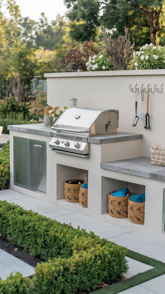 Efficient storage keeps your BBQ area organized and clutter-free. Incorporate built-in cabinets or shelves near the grill for utensils and condiments. Use hooks or magnetic strips for tools, and consider adding storage benches for larger items like charcoal or propane tanks. Stylish baskets or bins can add a decorative touch while serving as storage.