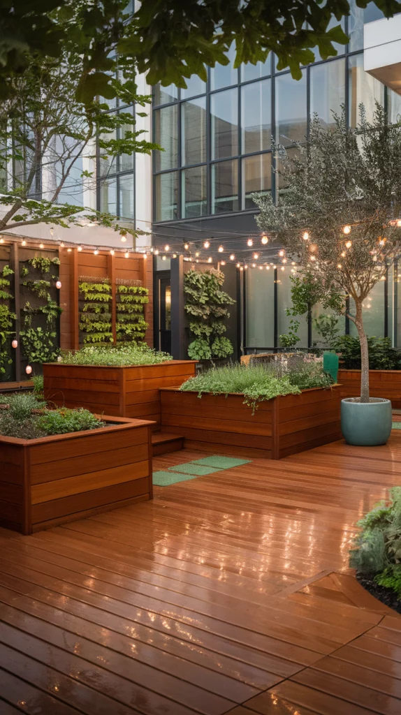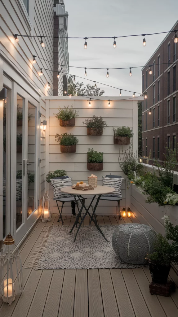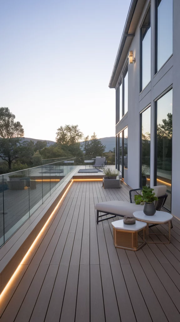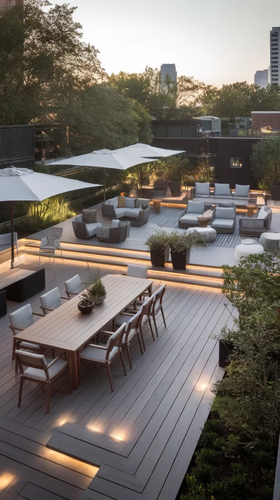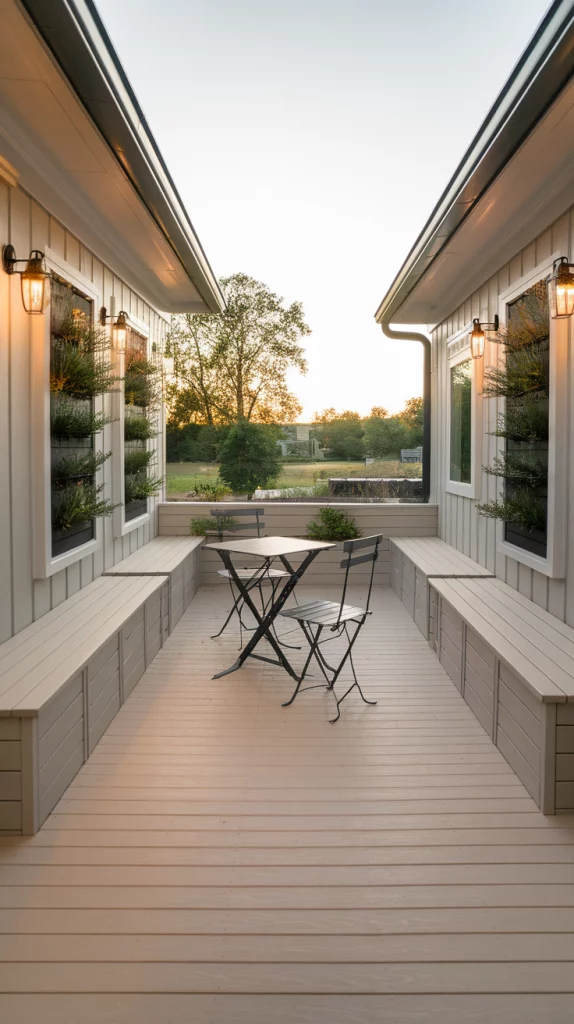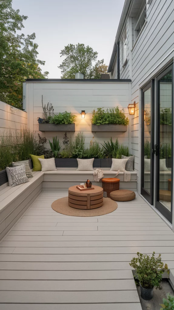 Even small spaces can benefit from a well-designed outdoor deck. Choose light-colored decking, foldable furniture, and multi-purpose storage benches to maximize space. Adding vertical gardens and wall-mounted lighting keeps the area open and inviting. Floating benches and narrow dining tables also enhance functionality without overcrowding the space.