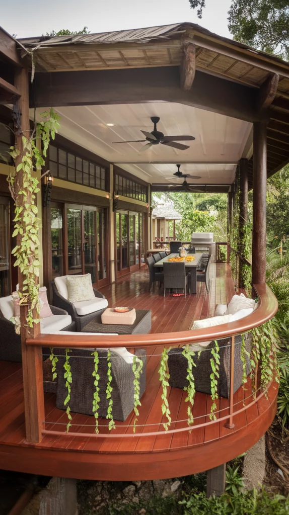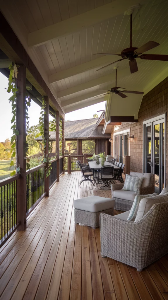 A wraparound deck is perfect for homeowners who want a seamless connection between indoor and outdoor spaces. These decks extend around the home, offering multiple zones for dining, lounging, and relaxing. Choose wide wooden planks, railings with decorative details, and large patio furniture to create a grand yet cozy feel. Outdoor swings, ceiling fans, and climbing vines can add charm and functionality.