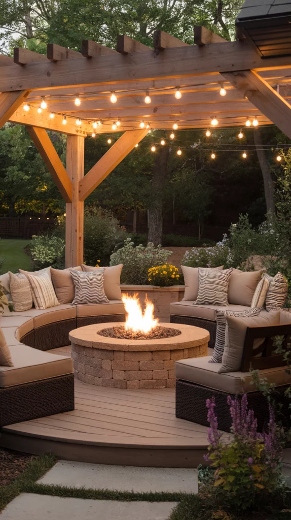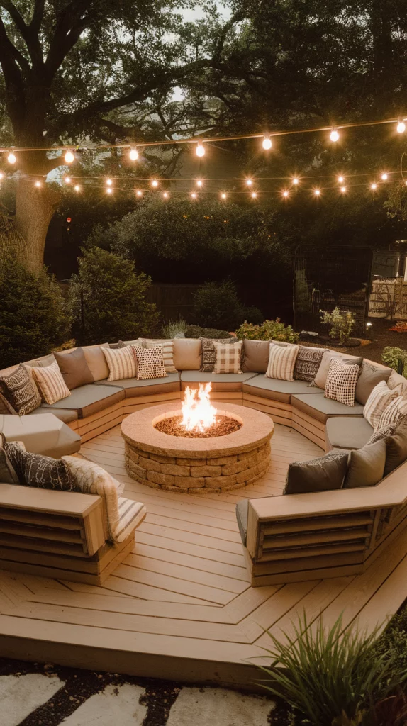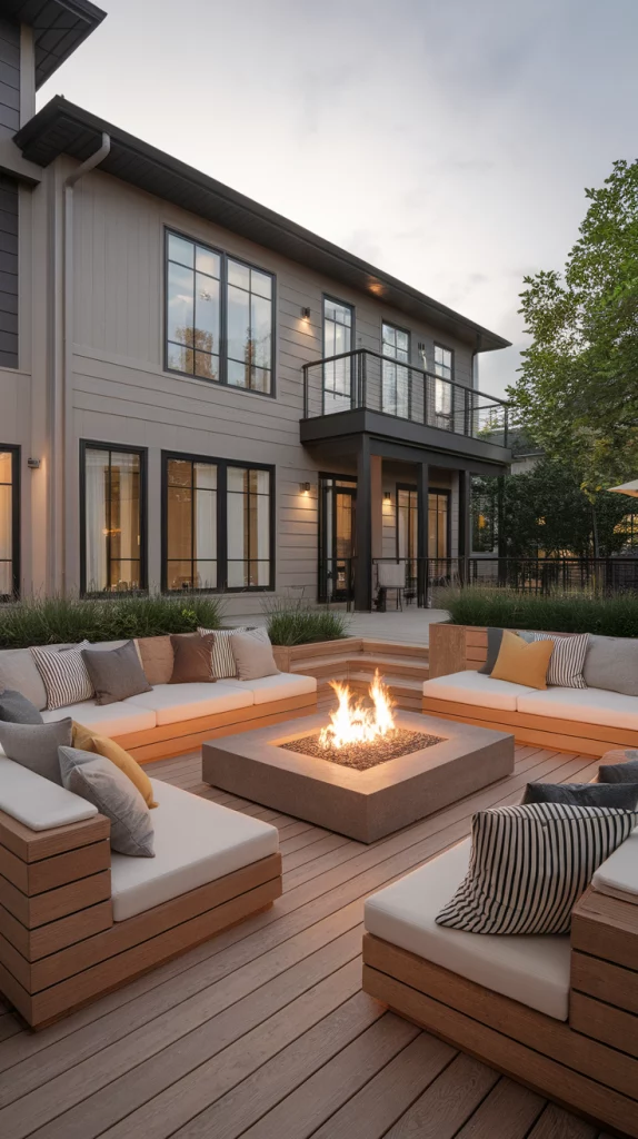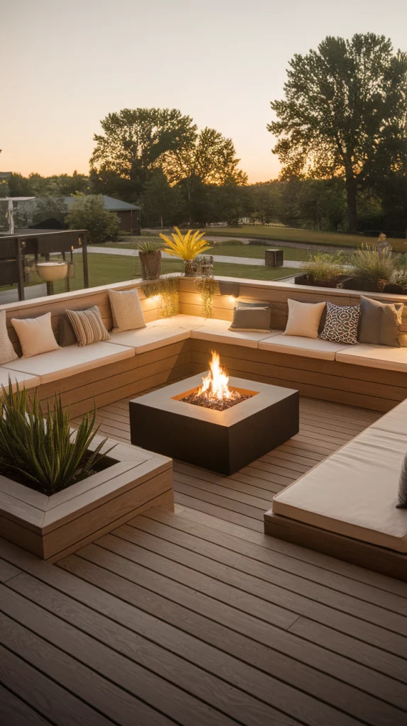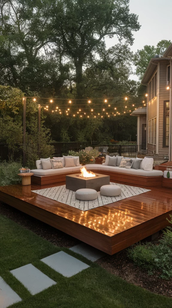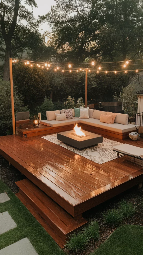 A built-in fire pit deck is perfect for cool evenings and social gatherings. Use circular seating arrangements, stone or concrete fire pits, and cozy outdoor cushions for comfort. Choose weather-resistant materials and soft LED string lights to enhance the atmosphere. This design works great for both large and small backyards.