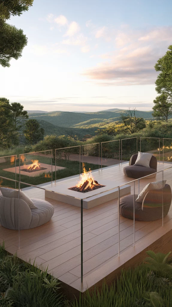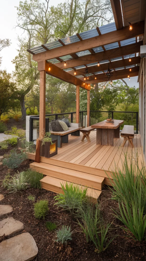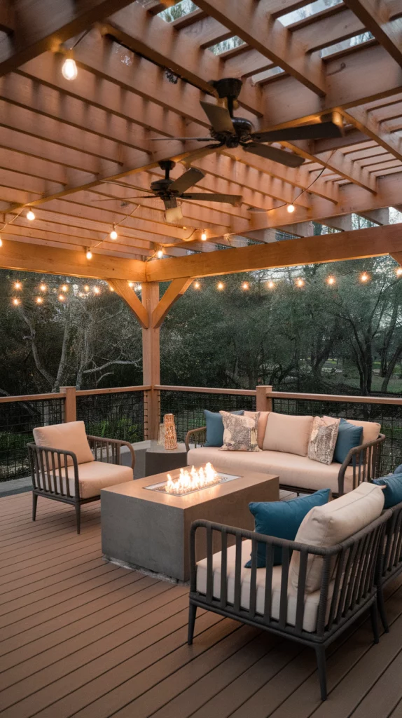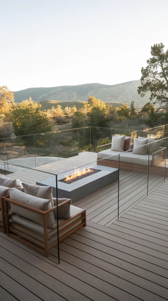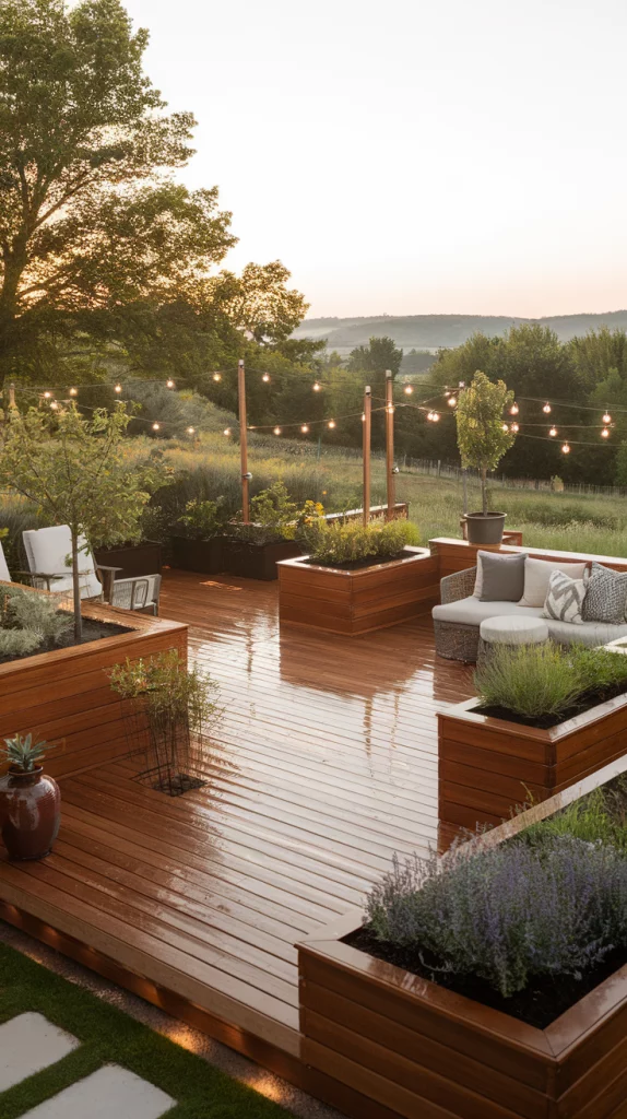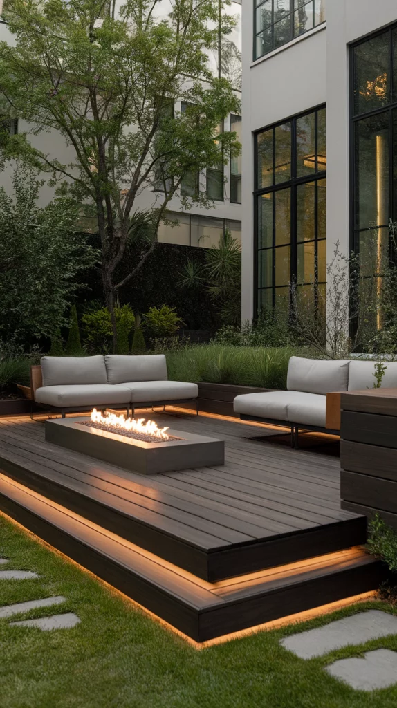 A built-in fire pit deck is perfect for cool evenings and social gatherings. Use circular seating arrangements, stone or concrete fire pits, and cozy outdoor cushions for comfort. Choose weather-resistant materials and soft LED string lights to enhance the atmosphere. This design works great for both large and small backyards.