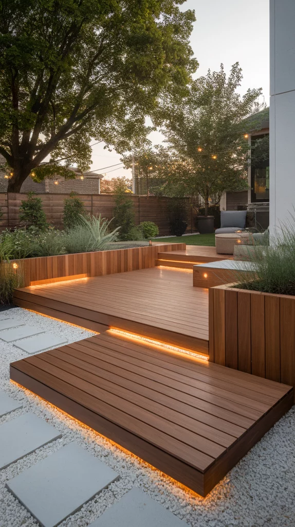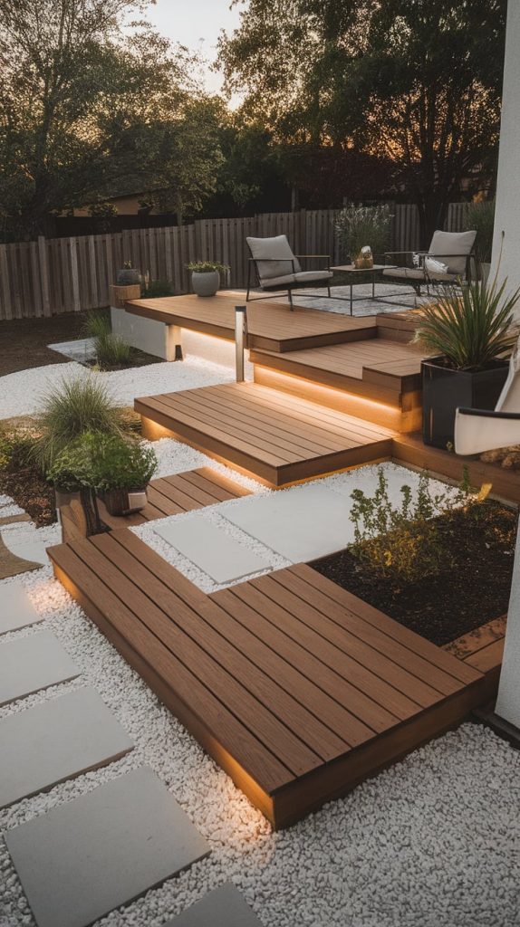 A floating wood deck over gravel creates a sleek, contemporary look while offering excellent drainage. Use stained wood planks to contrast beautifully against gray or white gravel. Add stepping stones leading to the deck, integrated planters, and outdoor lighting to enhance the modern appeal. This style is easy to install and budget-friendly, making it a great DIY option.