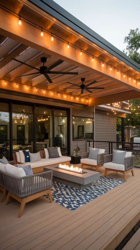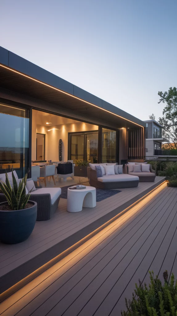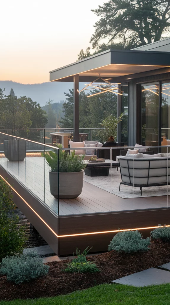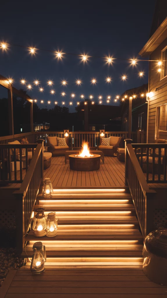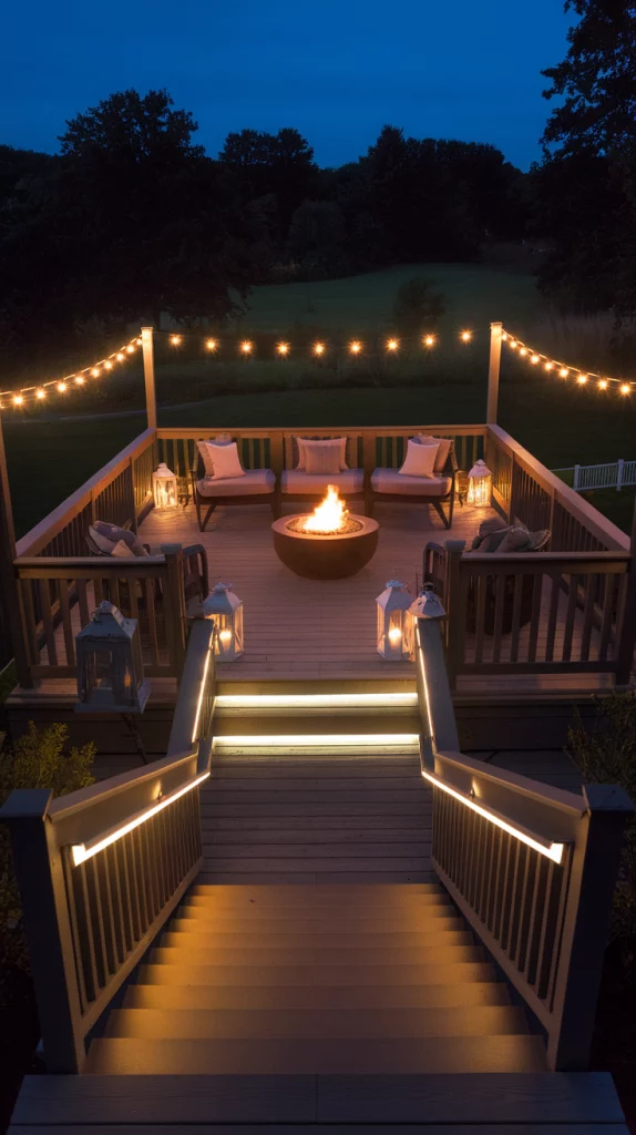 Deck lighting plays a crucial role in setting the mood for an outdoor space. Use string lights for a warm, inviting glow, recessed deck lights for subtle illumination, or solar-powered lanterns for an eco-friendly touch. LED strip lighting along railings and stairs enhances safety and aesthetics. Incorporate fire pits, candles, or torches to create a cozy, intimate atmosphere.