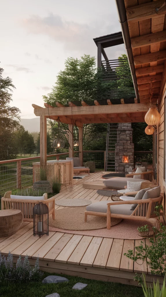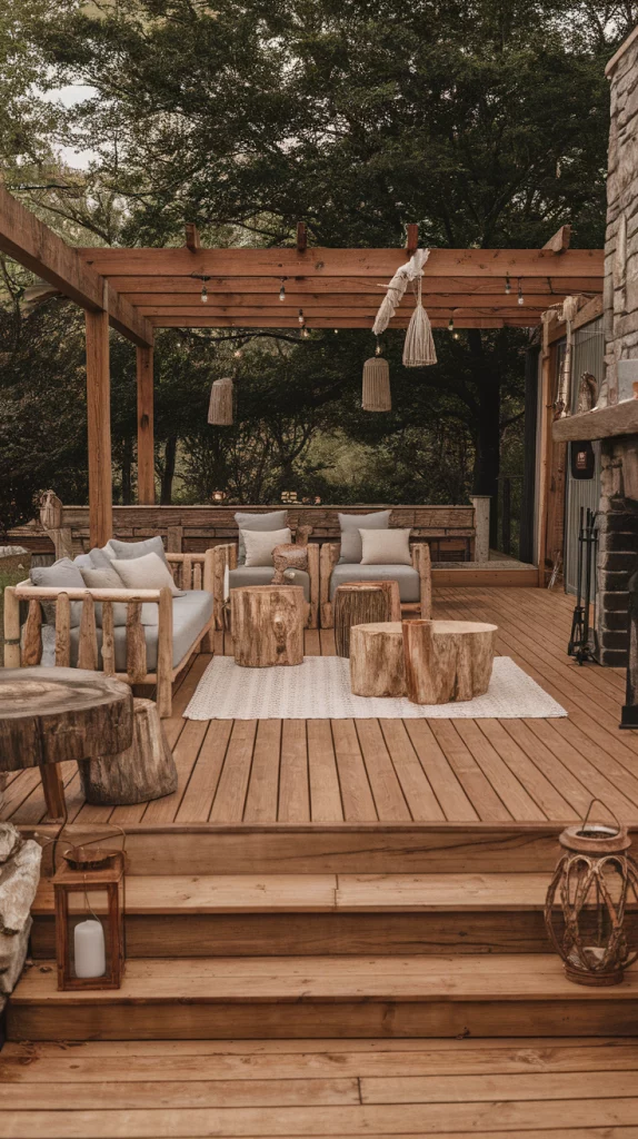 A rustic wooden deck brings warmth and character to an outdoor space. Using natural wood planks, this design is often complemented by log-style furniture, woven rugs, and warm-toned lighting. Add a stone fireplace, wooden pergola, or hanging lanterns to create a cozy ambiance. This setup is perfect for backyard retreats, cabin-style homes, or anyone who loves the organic feel of nature.