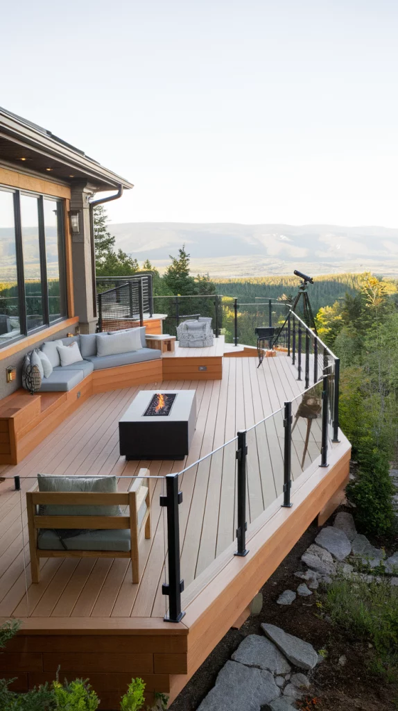 An elevated deck is ideal for homes in hilly or scenic locations, providing a panoramic view of the surroundings. Choose glass railings to keep the view unobstructed and add built-in benches, a telescope, or a fire pit for a cozy retreat. Opt for natural wood flooring with warm tones to blend seamlessly with the landscape. This style is perfect for mountain homes, lake houses, or coastal properties.