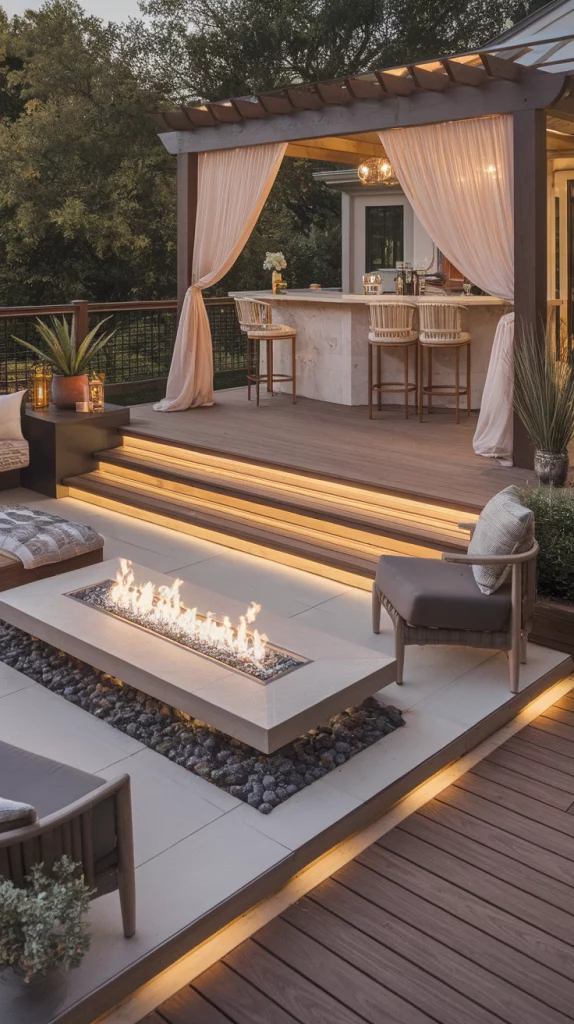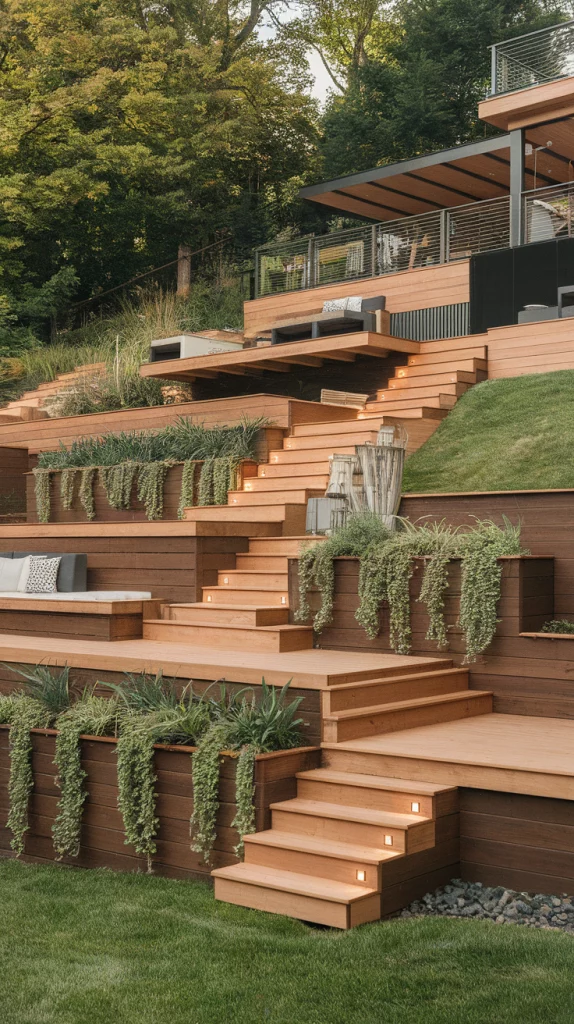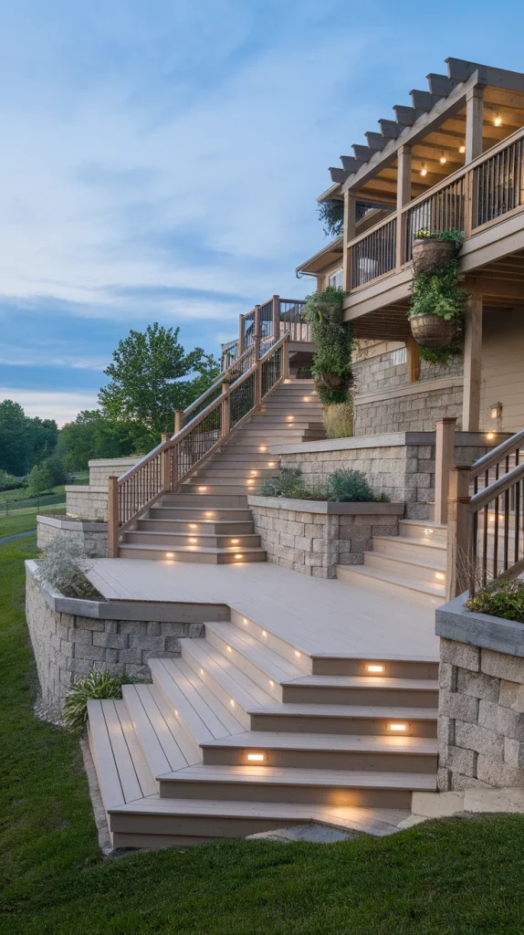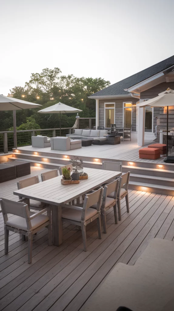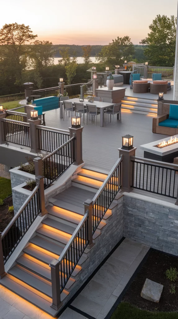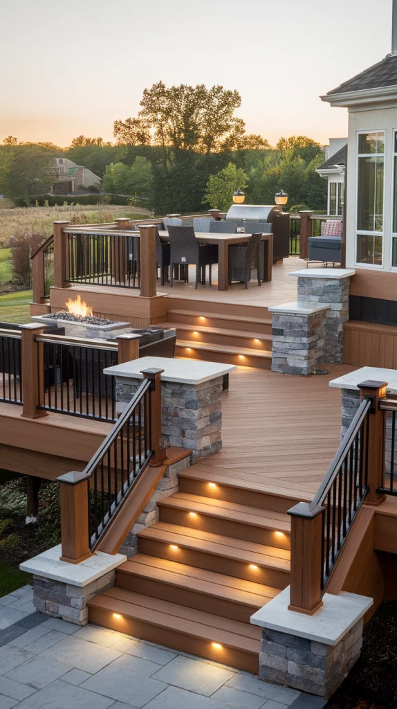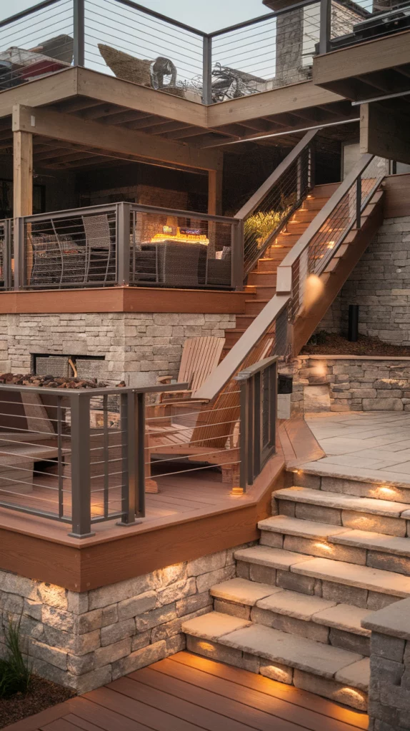 A multi-level deck maximizes space and creates distinct areas for dining, lounging, and entertaining. Use different materials like wood, stone, and metal railings to create contrast. Incorporate built-in planters, stair lighting, and cozy seating zones to add functionality. This setup works well for large backyards or sloped landscapes.