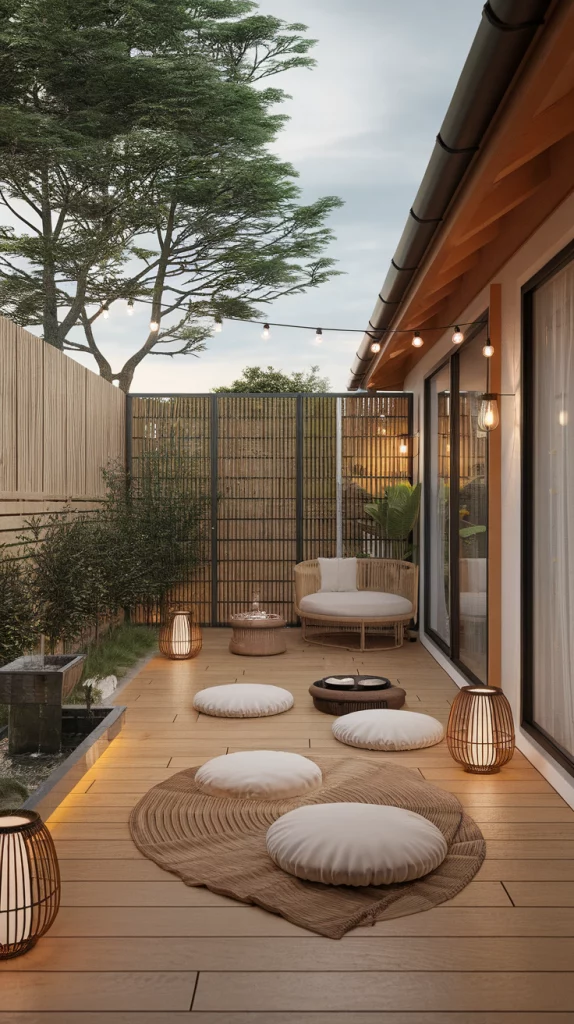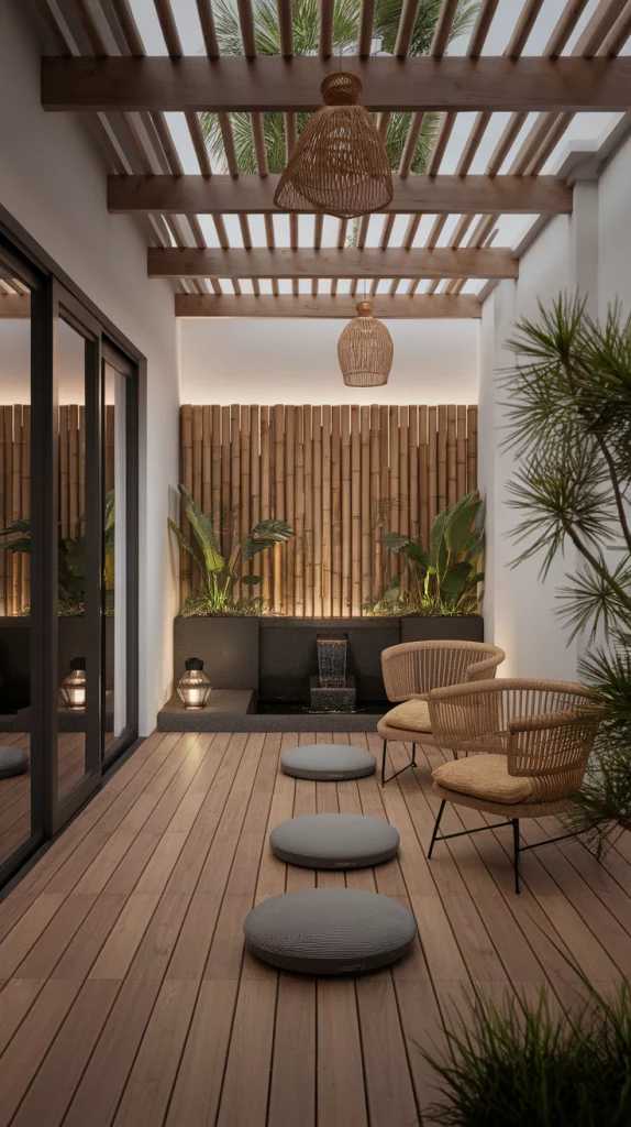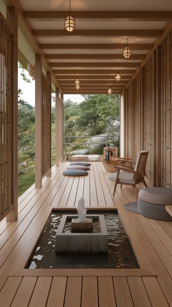 A Zen-inspired deck is designed for relaxation and harmony with nature. Use natural wood, stone accents, and minimalist furniture to create a peaceful setting. Incorporate water features, bamboo elements, meditation cushions, and soft lighting to enhance tranquility. Japanese-style pergolas, sand gardens, and stepping stones add to the Zen ambiance.