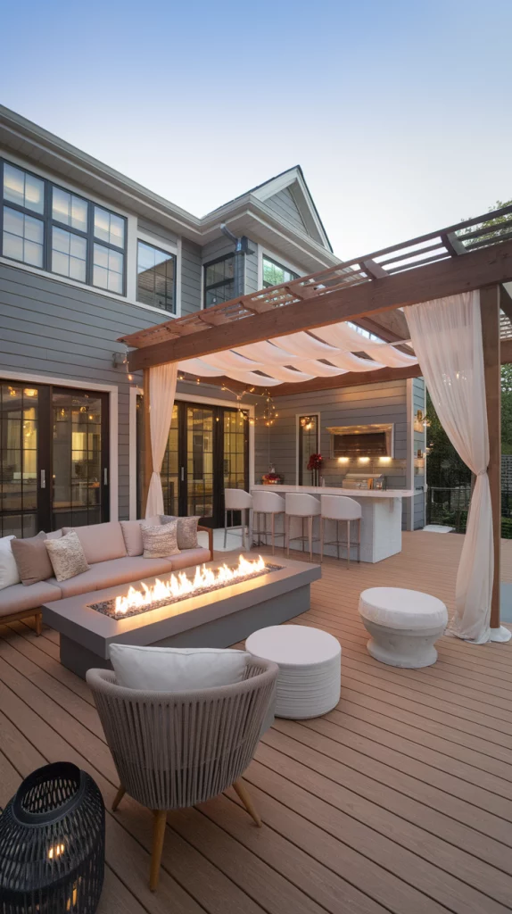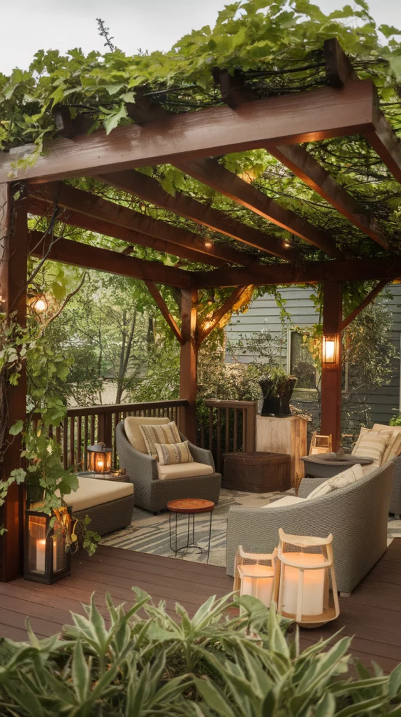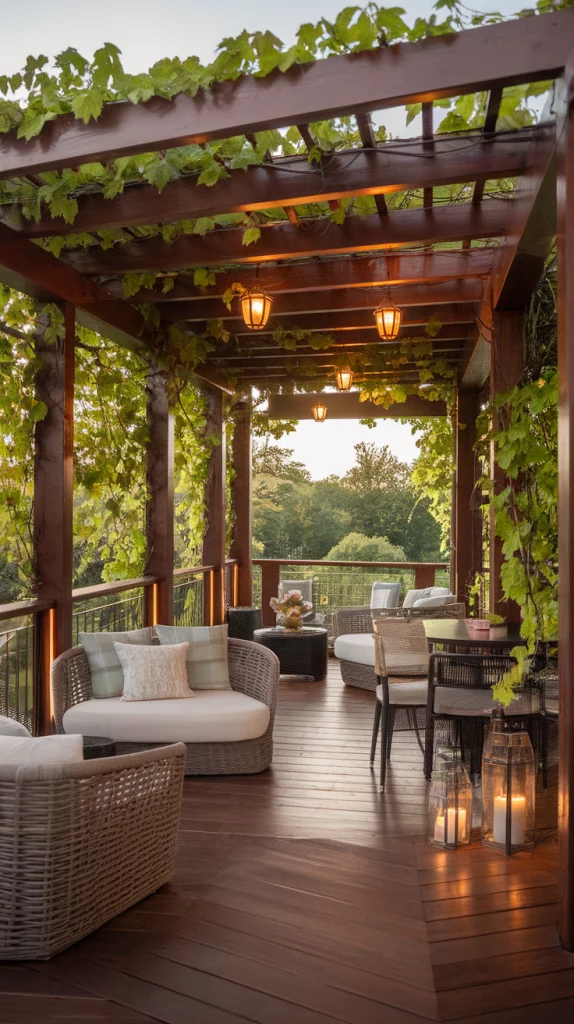 A deck with a pergola creates an elegant and shaded outdoor retreat. Whether you opt for a wooden, metal, or vinyl pergola, it can be enhanced with climbing vines, hanging lanterns, or draped curtains for added privacy. Lattice-roof pergolas provide a mix of sunlight and shade, while motorized versions allow full control over the light exposure.