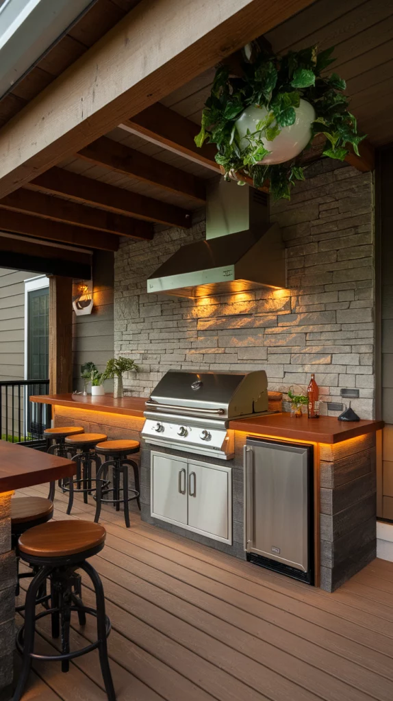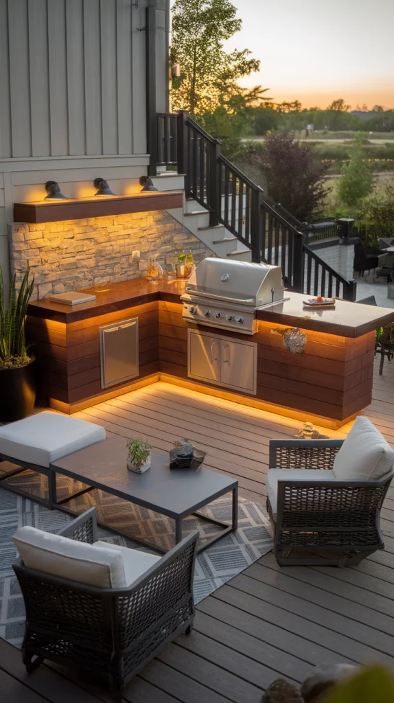 An outdoor kitchen deck takes backyard entertaining to the next level. Install a built-in grill, countertop space, and storage cabinets to make cooking convenient. A bar counter with stools, a mini fridge, and a pizza oven add functionality. Choose stainless steel appliances for durability and stone or wood finishes for a stylish look. String lights or LED under-counter lighting enhance nighttime ambiance.