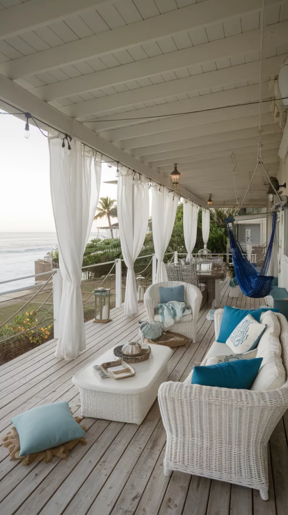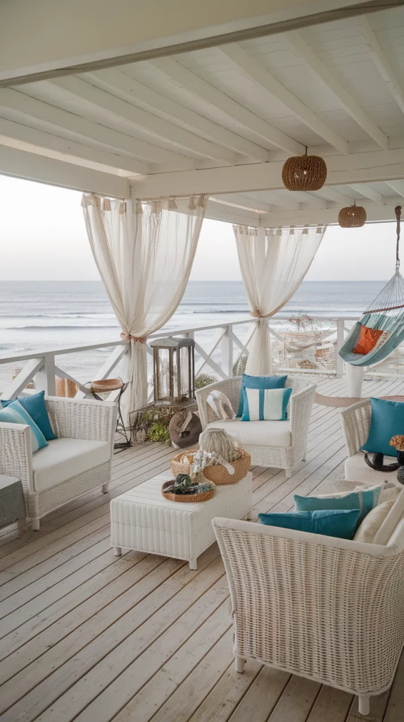 A coastal-inspired deck brings the tranquility of the beach to your home. Light-colored weathered wood flooring, white wicker furniture, and nautical décor like rope accents and lanterns help achieve this style. Incorporate ocean-blue cushions and sheer curtains for a breezy, relaxing ambiance. Outdoor hammocks or swinging chairs can enhance the laid-back feel.