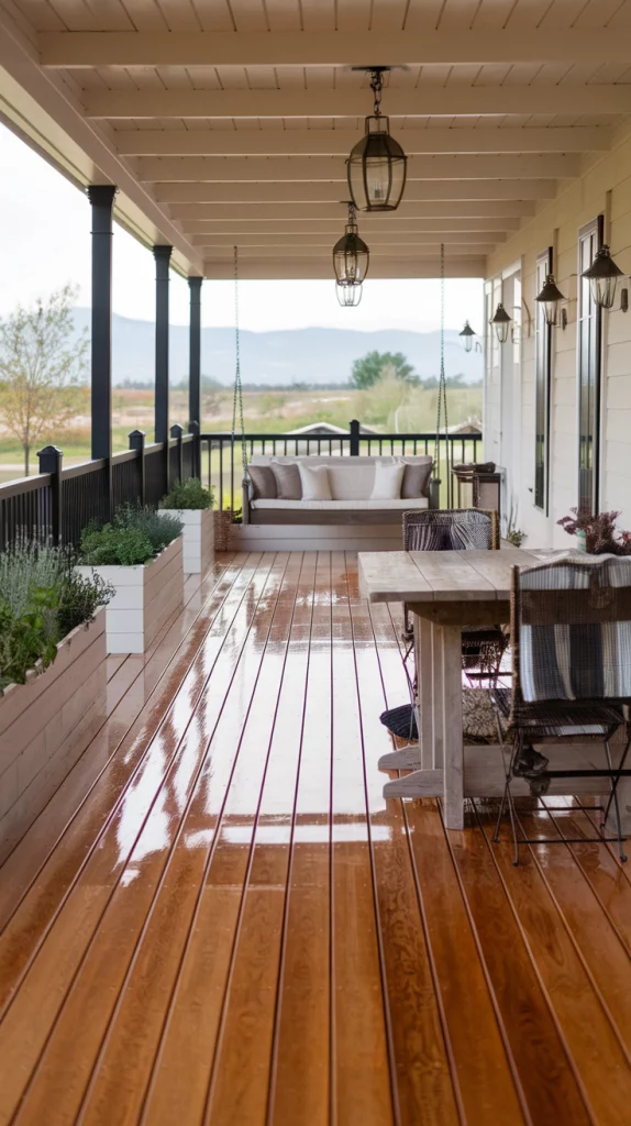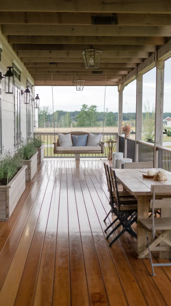A farmhouse-style deck combines warm wood tones, vintage charm, and functional simplicity. Use wide-plank wooden flooring, reclaimed wood furniture, and black metal accents for a rustic yet refined look. Add porch swings, lantern-style lighting, and cozy plaid throws to complete the aesthetic. Built-in planters with herbs or flowers can bring an organic touch to the space.