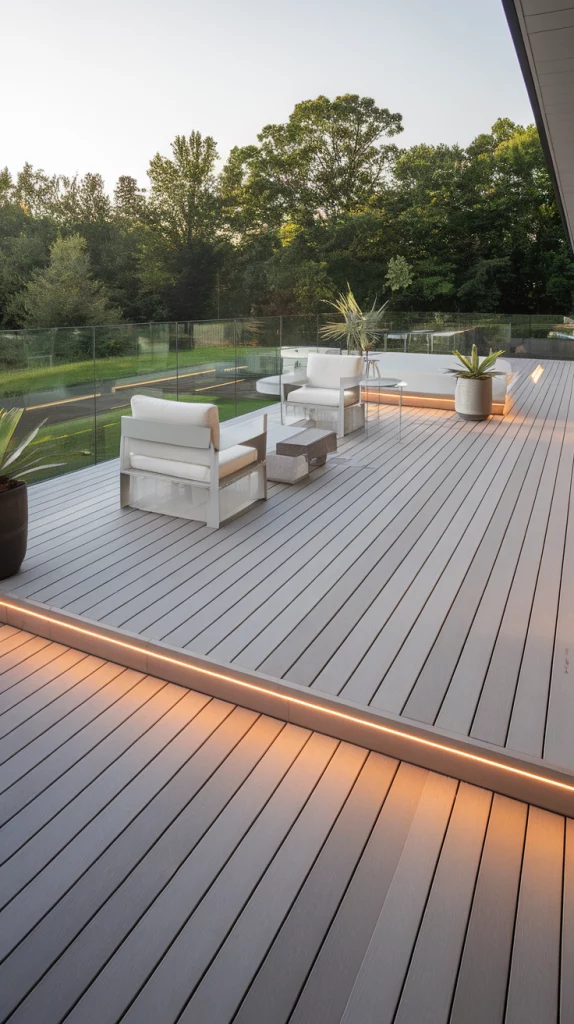 A modern minimalist deck is defined by its clean lines, open space, and sleek materials. Think composite decking in neutral tones, built-in seating, and hidden lighting for a seamless look. Minimalist decks often incorporate glass railings, concrete planters, and low-profile furniture with a monochrome or earthy palette. This design is perfect for those who love simplicity and function while maintaining an elegant outdoor aesthetic.