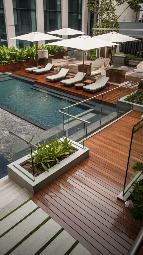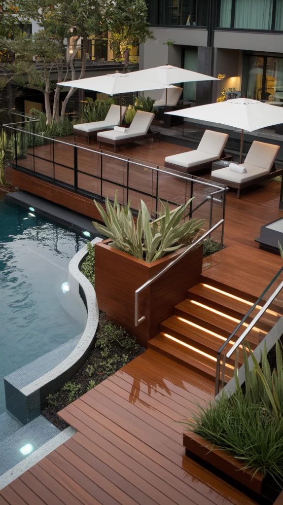 A poolside deck should feel luxurious and practical. Use non-slip decking materials, comfortable lounge chairs, and shade umbrellas for relaxation. Incorporate glass railings or sleek fencing for a contemporary look. Adding built-in planters and water-resistant furniture completes the high-end aesthetic.