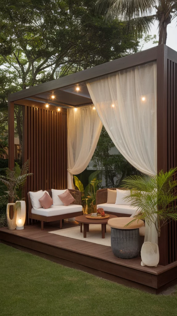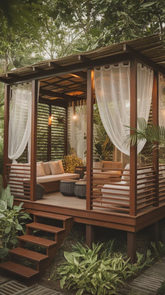 A floating deck is a stylish and modern way to create an outdoor escape. With elevated platforms, this design creates the illusion of weightlessness. Use dark-stained wood, hidden LED lighting, and low-profile outdoor sofas to maintain a sleek aesthetic. Floating decks are perfect for urban homes and minimalist outdoor spaces.