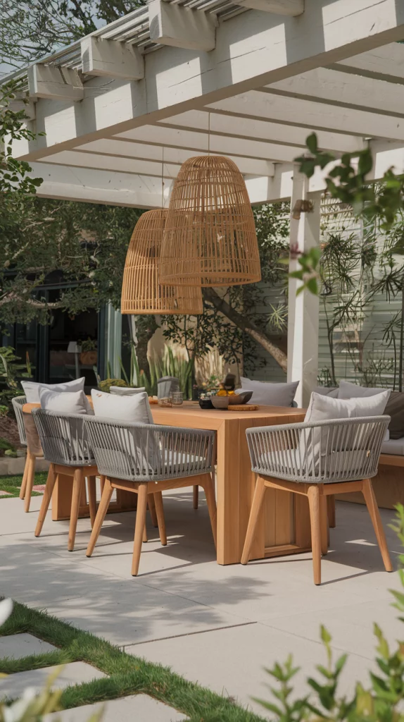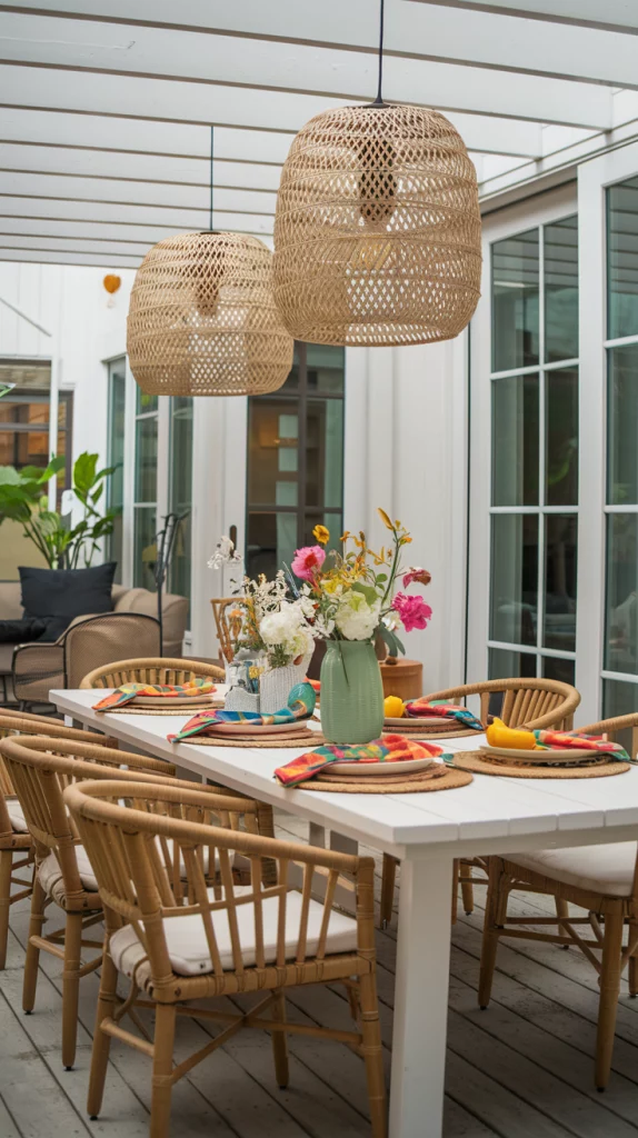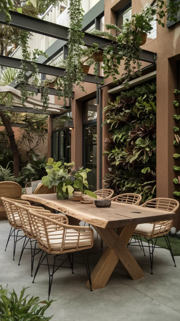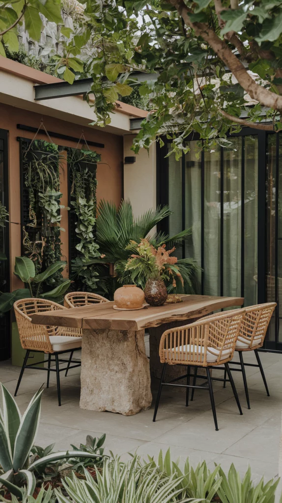 Bring nature into your outdoor dining area with rustic touches like a wooden table, rattan chairs, and decor made from natural materials. Add greenery with hanging plants, a small vertical garden, or a centerpiece of fresh flowers. Earthy tones and organic textures will make the space feel serene and connected to the outdoors.