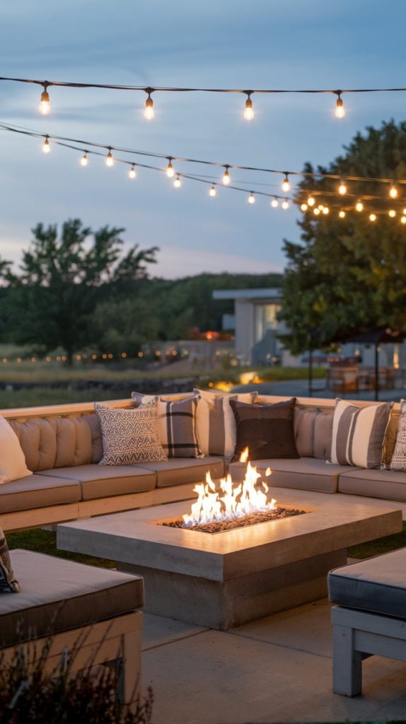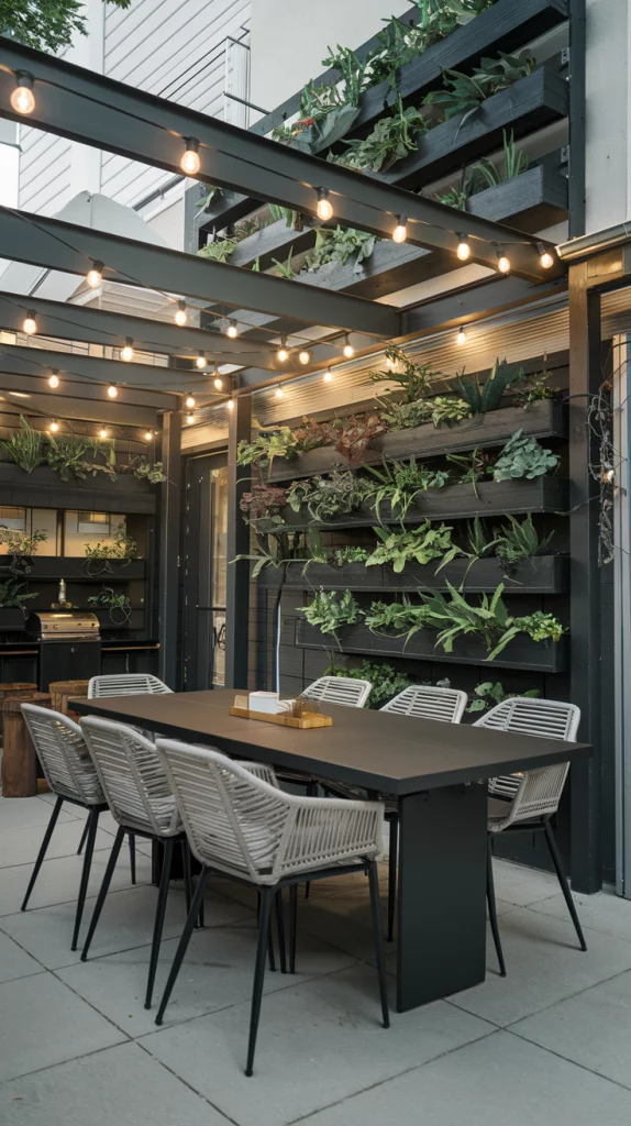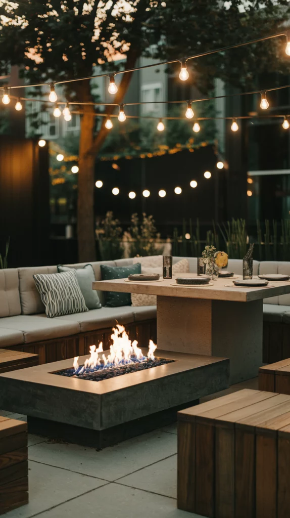 Adding a fire pit to your outdoor dining area creates a cozy focal point for gatherings. Position the dining table near the fire pit to keep the space warm and inviting during cooler evenings. Choose a modern fire pit design, such as a concrete or steel bowl, to match the aesthetic. Decorate the area with cushioned seating around the fire pit and string lights for a magical atmosphere.