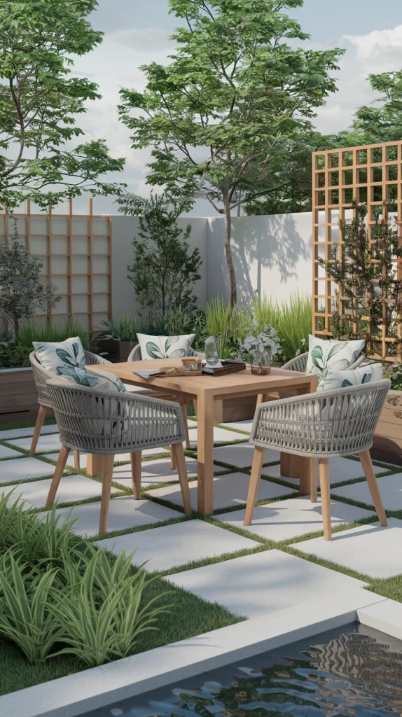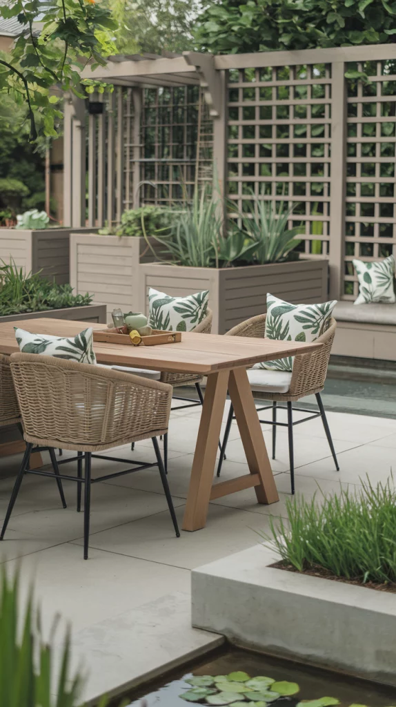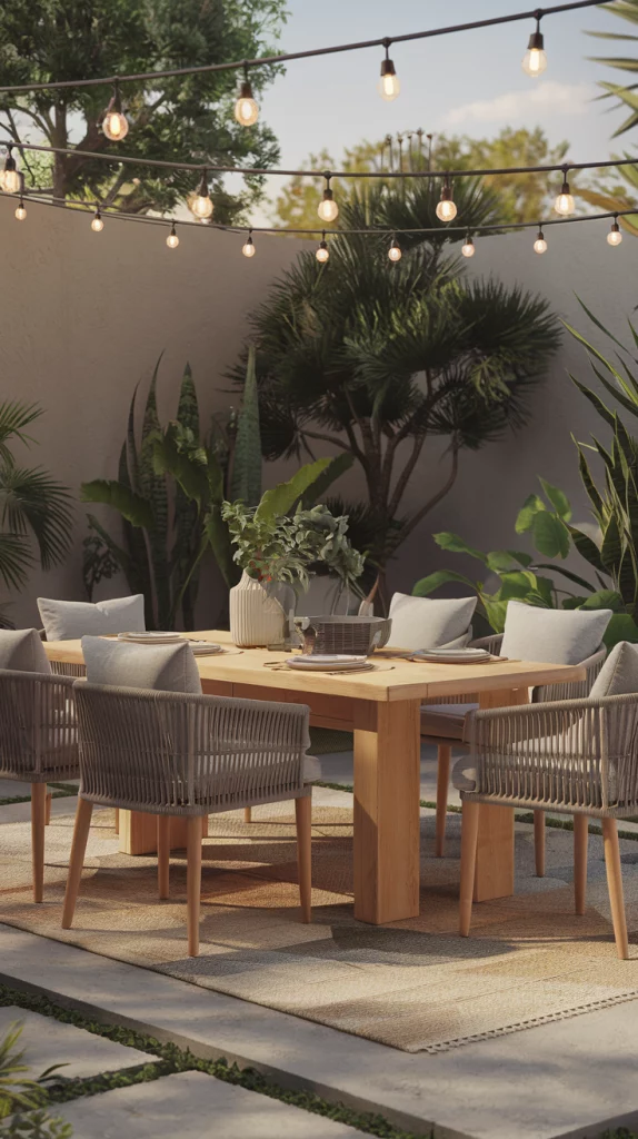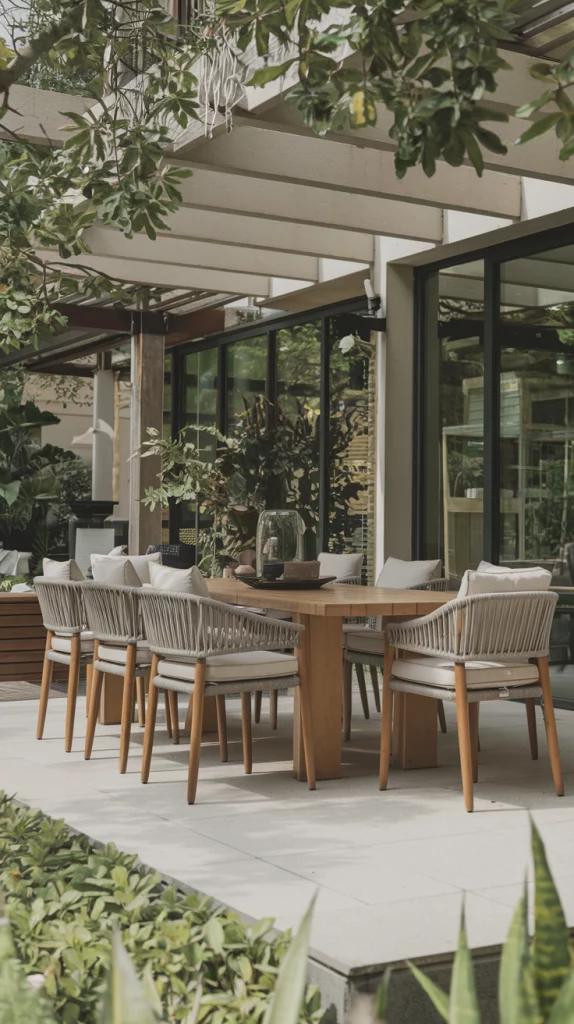 Invest in weatherproof furniture for durability and year-round use. Teak, aluminum, and resin wicker are excellent choices for outdoor dining sets. Add cushions with UV- and water-resistant fabric to maintain comfort and style. A protective furniture cover can help extend the lifespan of your pieces.