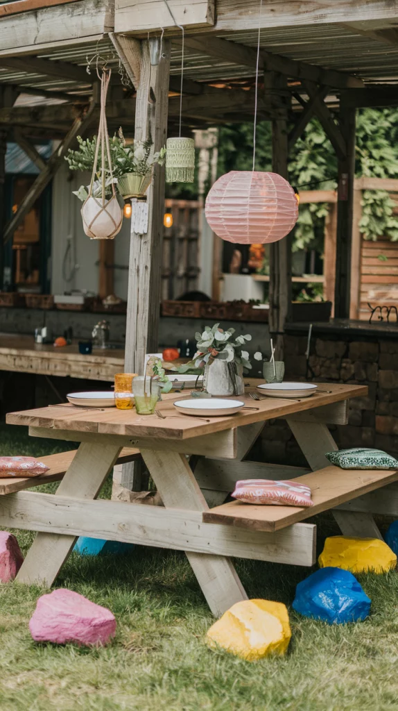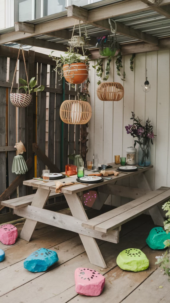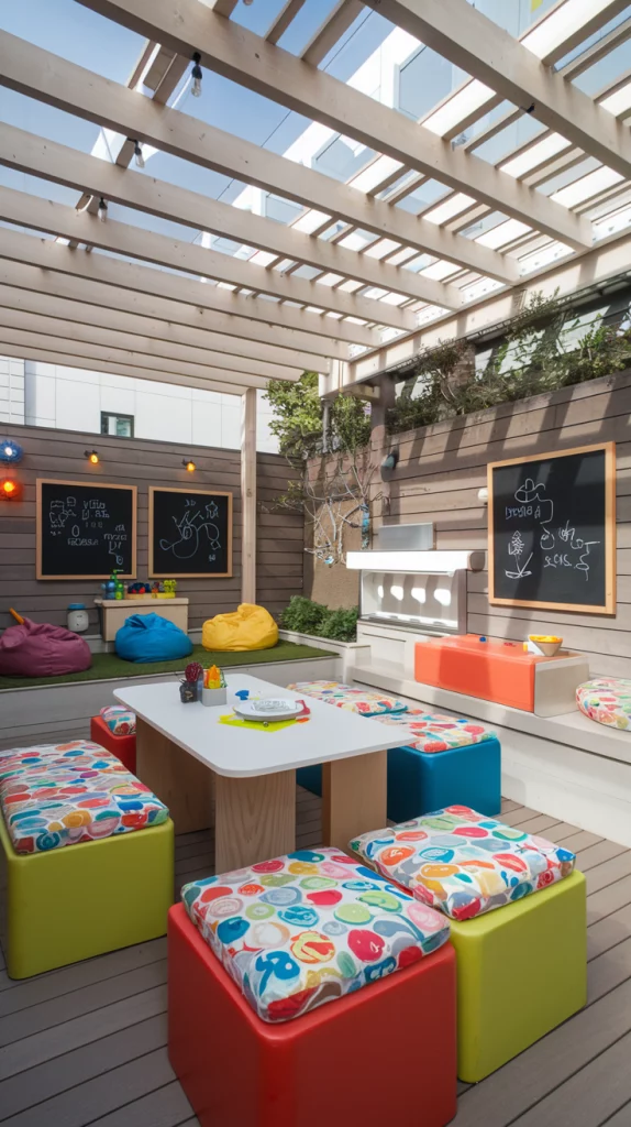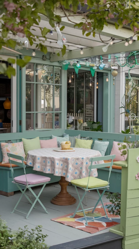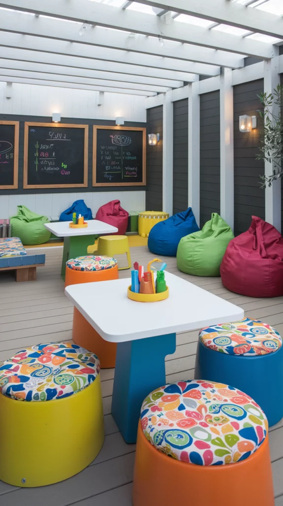 Designing a kid-friendly outdoor dining space involves incorporating fun and practical elements. Use colorful, easy-to-clean furniture and shatterproof dinnerware to keep things safe. Add a small play area nearby with chalkboards, bean bags, or a sandbox to entertain the little ones. Brightly colored decor, such as bunting or patterned cushions, will make the space appealing and cheerful.