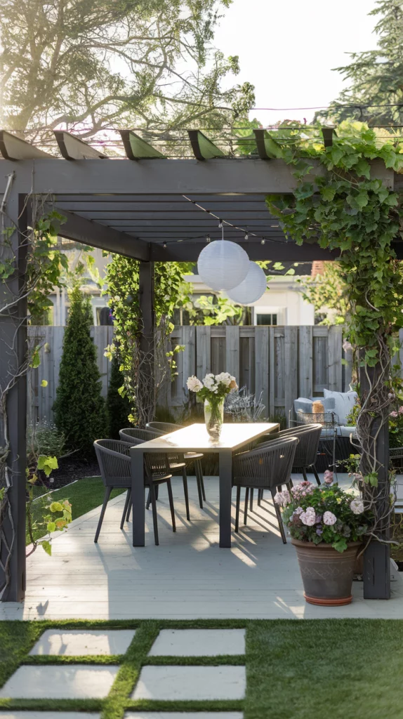 Pergolas and gazebos add both style and functionality to an outdoor dining area. A pergola draped with flowing curtains or climbing plants provides shade and a touch of elegance. For a more enclosed feel, use a gazebo with built-in lighting and mosquito netting. Pair the structure with a dining set in a complementary style and enhance the decor with hanging lanterns or potted flowers.
