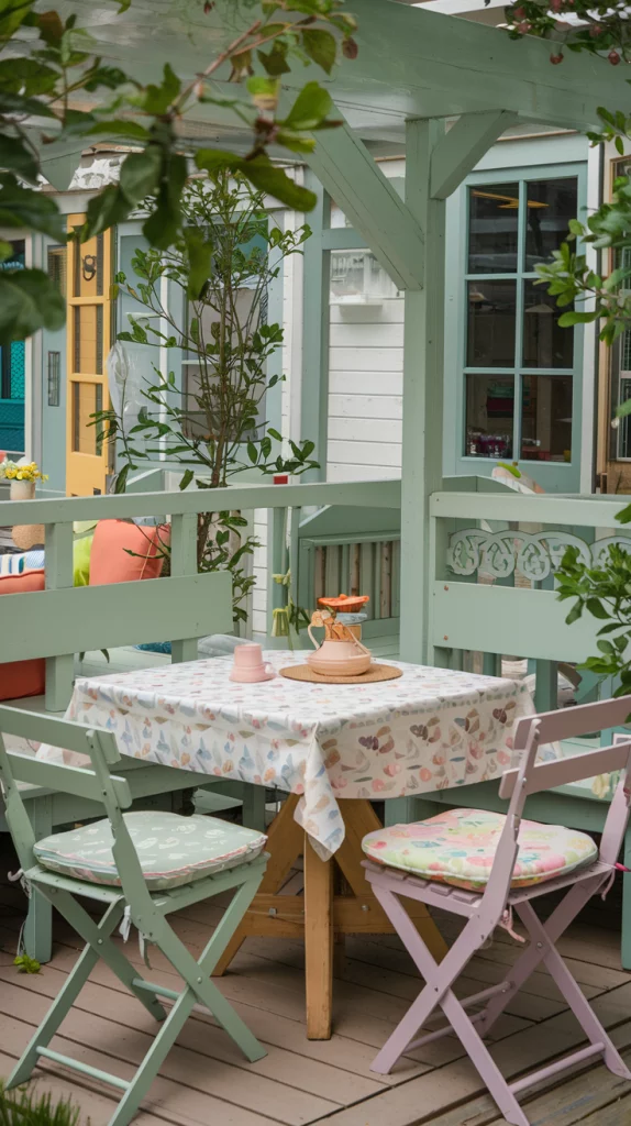 Color schemes can define the vibe of your outdoor dining area. For a cute and playful design, incorporate pastel hues like soft pinks, blues, and yellows into the decor. Use colorful cushions, a patterned tablecloth, or painted furniture for a cheerful touch. For a more tranquil setup, stick to earthy tones such as greens and browns, complemented by natural wood and plants.