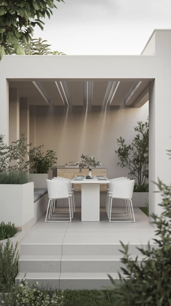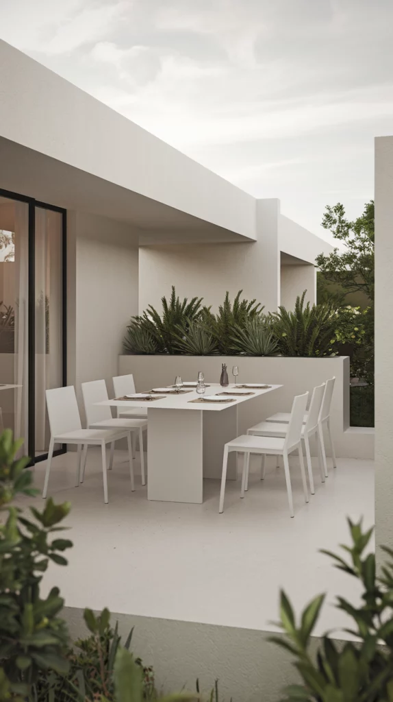 A minimalist outdoor dining area is perfect for families who appreciate simplicity and clean lines. Choose a sleek dining set with a compact table and comfortable chairs in muted colors like white or gray. Keep the decor understated, with a single statement piece like a geometric planter or a modern light fixture. Opt for a simple yet functional layout that avoids clutter and maximizes open space.