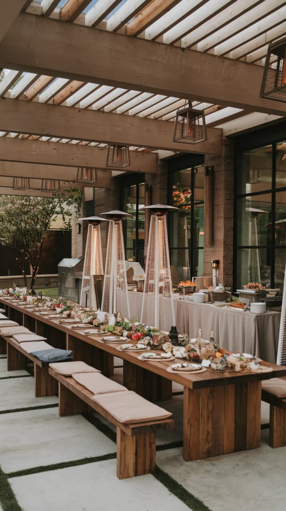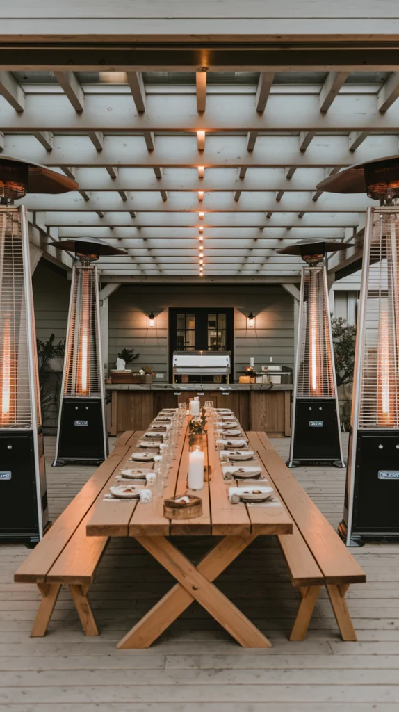 For larger family gatherings, create an outdoor dining area that prioritizes comfort and functionality. Use an extra-long dining table with bench seating to accommodate more guests. Incorporate a buffet station or bar cart for serving food and drinks. Add outdoor heaters or a fire pit for warmth and extend the space with additional seating areas. This setup ensures everyone feels welcome and comfortable.