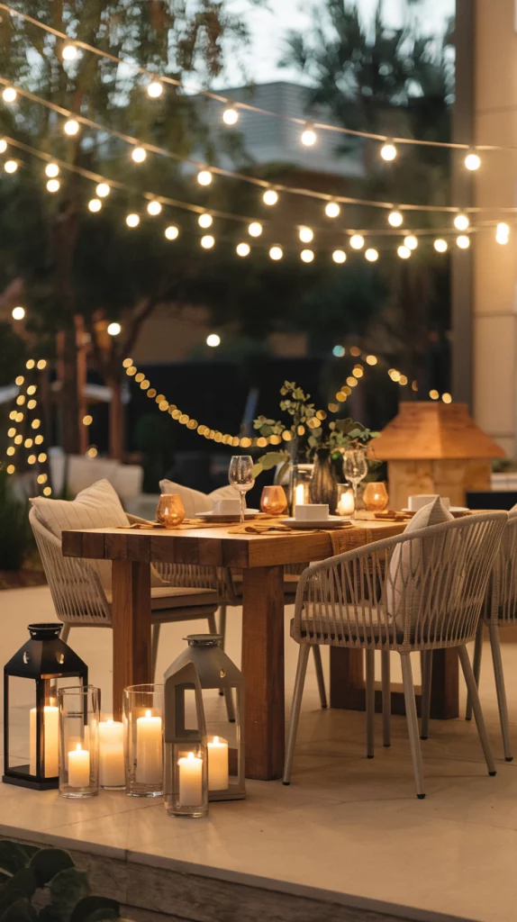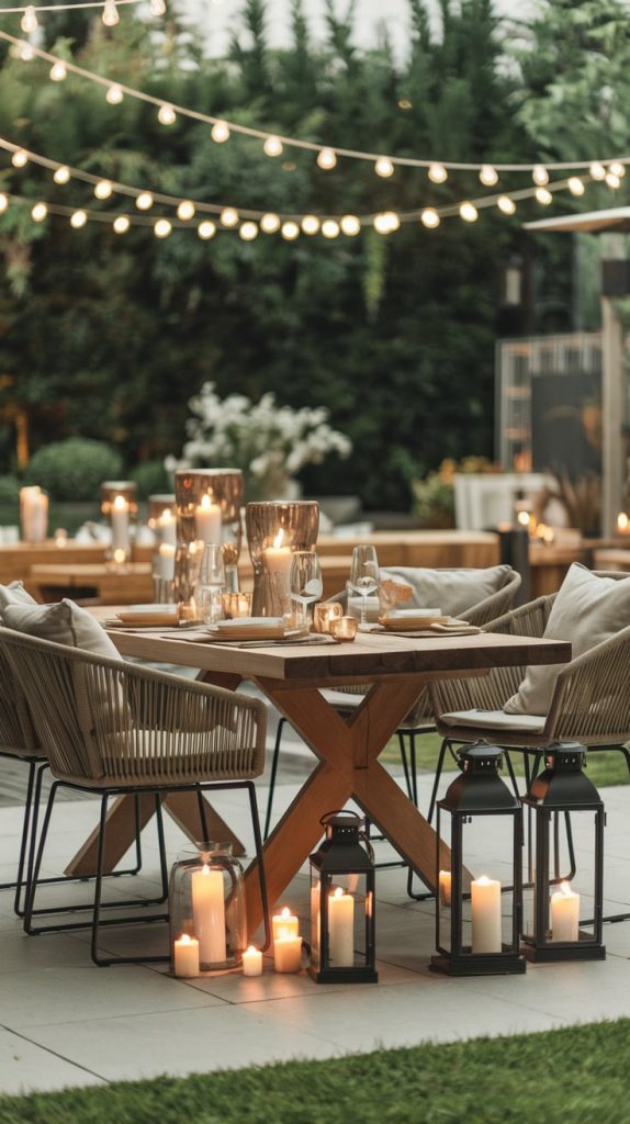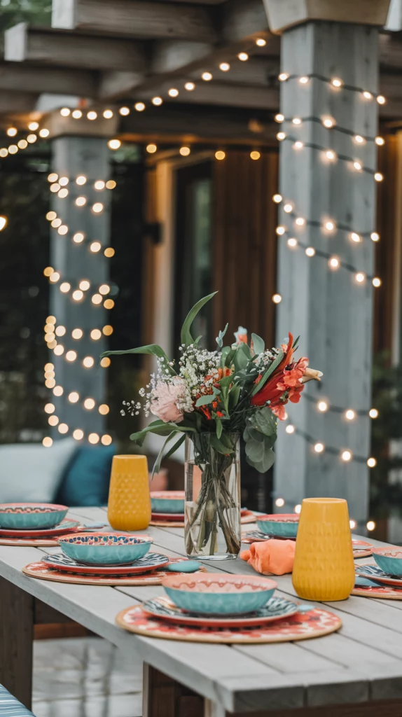 String lights are a simple yet impactful way to add charm to your outdoor dining area. Hang them above the table in a crisscross pattern or drape them along a pergola or fence. Choose warm-toned lights for a cozy vibe or colorful bulbs for a playful atmosphere. Pair the lighting with candles or lanterns for additional layers of illumination.