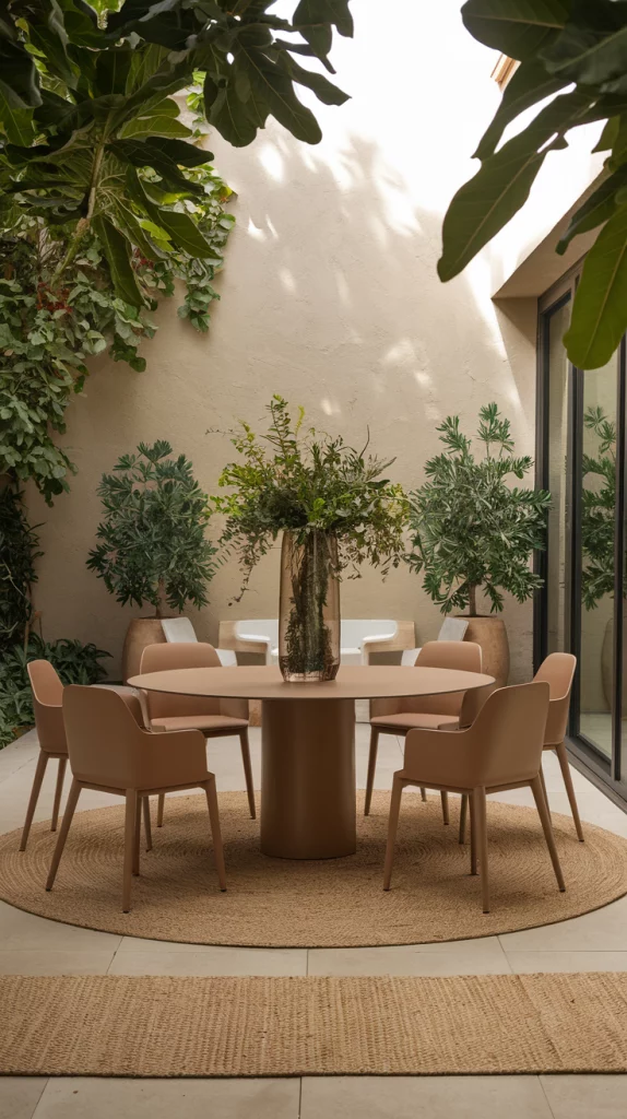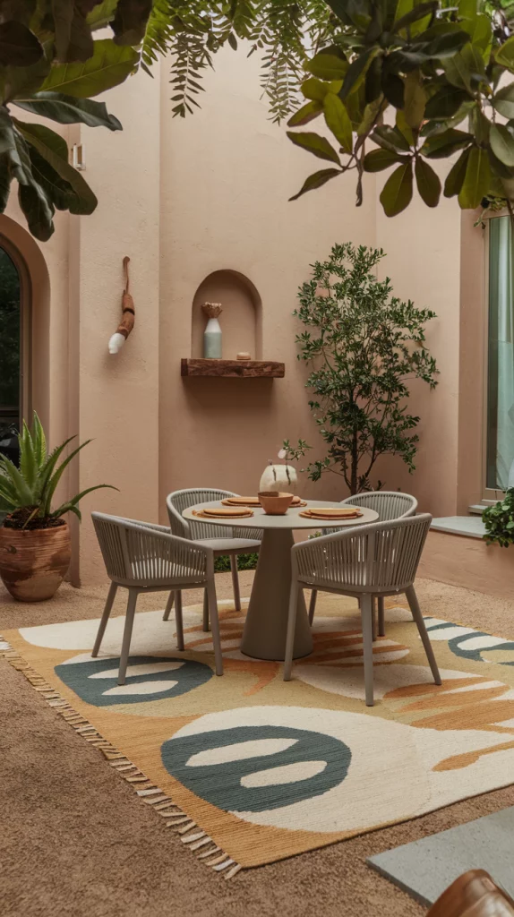Outdoor rugs can define your dining space and add a touch of elegance. Choose a durable, weather-resistant rug with patterns that complement your furniture and decor. Rugs in earthy or muted tones work well for a serene vibe, while bold patterns can make a statement in a minimalist setup.