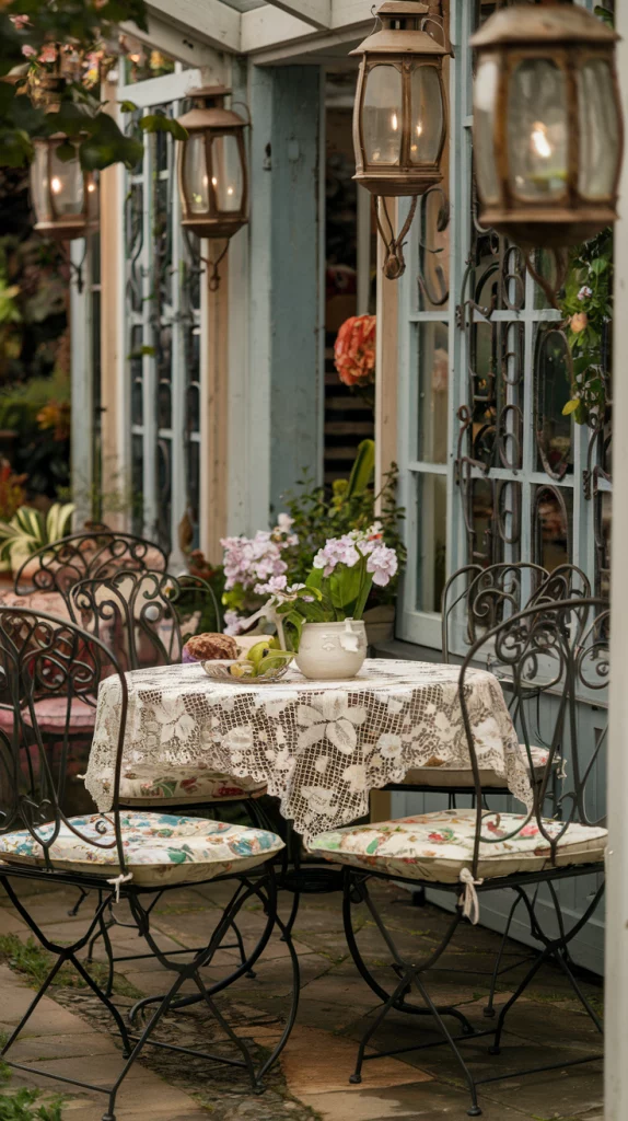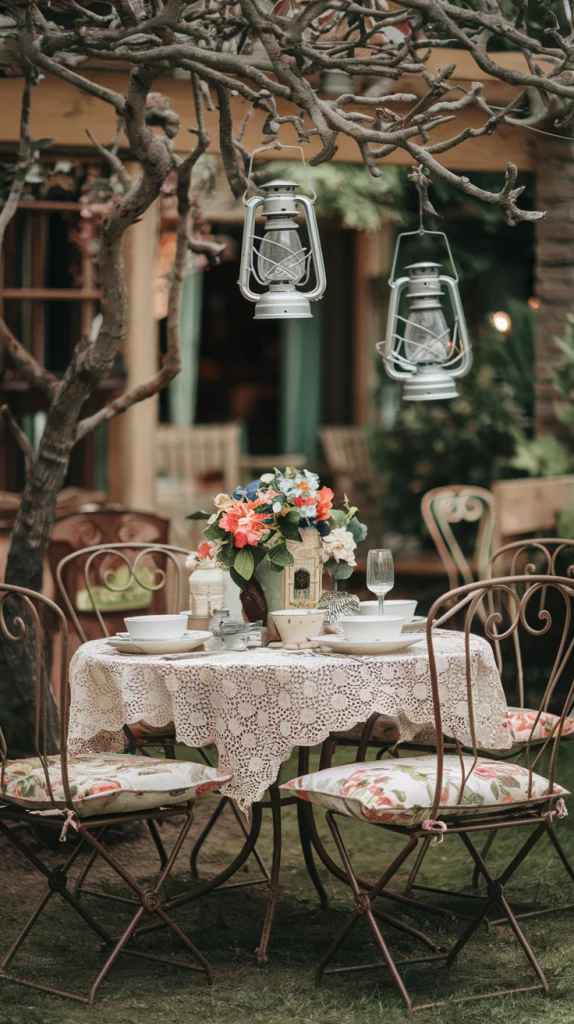 Vintage furniture can add a nostalgic and unique charm to your outdoor dining area. Look for wrought iron tables and chairs or distressed wooden furniture. Add lace tablecloths, vintage lanterns, and floral cushions to complete the look. This setup works beautifully in a garden or patio setting, creating a cozy and timeless ambiance.