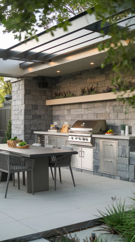 Combine functionality and convenience by incorporating an outdoor kitchen into your dining area. Add a built-in grill, a countertop for food prep, and cabinets for storage. Position the dining table nearby, creating a seamless flow between cooking and dining. Use durable materials like stainless steel and stone for a modern, cohesive look that’s perfect for entertaining family and friends.