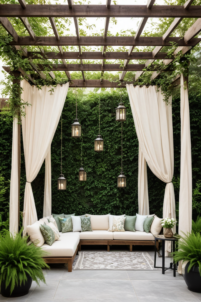 Putting a pergola or gazebo gives your outdoor area a place for gathering while also providing necessary shade. While a wooden frame gazebo with climbing curtains is elegant, a metal gazebo with the owners hanging drapes is also appealing. Hang up ceiling fans and lanterns for additional comfort.