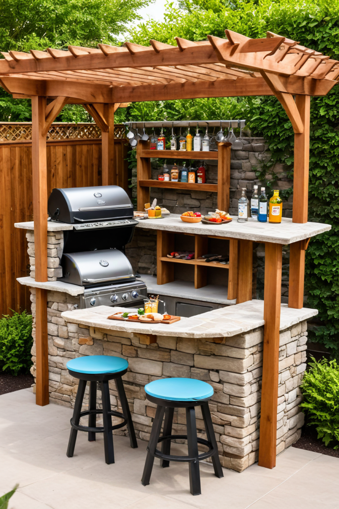 Setting up a DIY barbecue station is very practical for hosting get together, either alone or with friends. Instead of a traditional stone countertop, one can go for a portable BBQ cart along with a mini prep station. Along with barstools and condiments guarded by a wooden shelving unit, the outdoor area now becomes suitable for casual hangouts. To add some flair while countering the harsh sun, one can set up a pergola on top of the unit.
