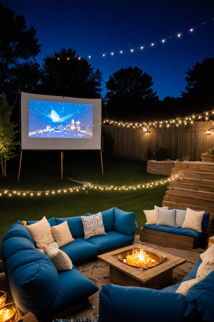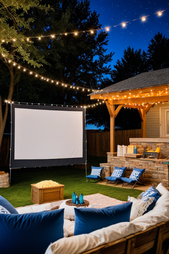 Transform your backyard into a cozy theater with a large outdoor screen, weatherproof projector and comfy seating. For added comfort, place floor cushions, bean bags, or reclining chairs. Ambient light can be achieved with string lights and lanterns and placing cute drinks and popcorn stations can make the vibe more fun! Make sure you set up wireless speakers for cinematic sound.