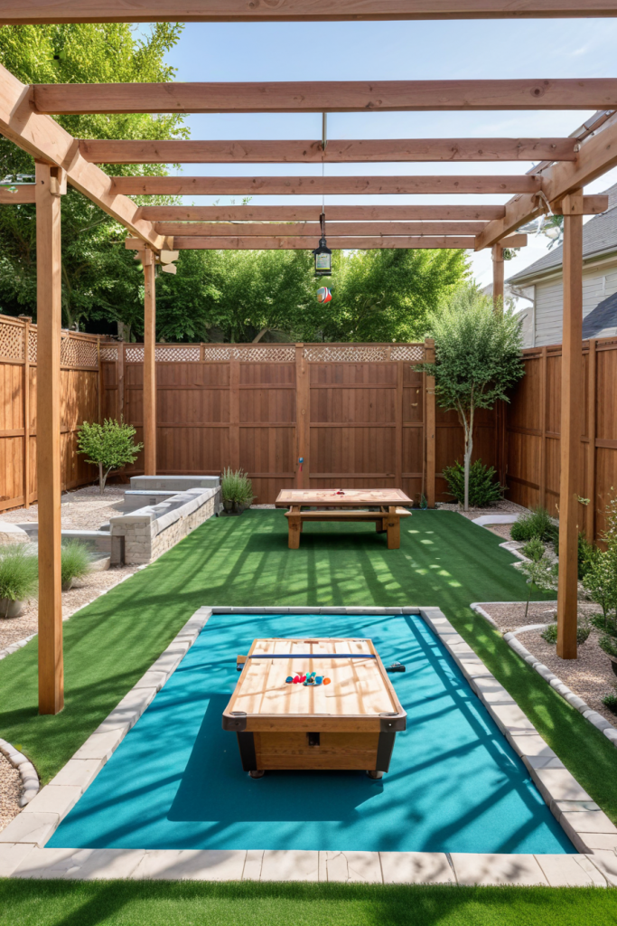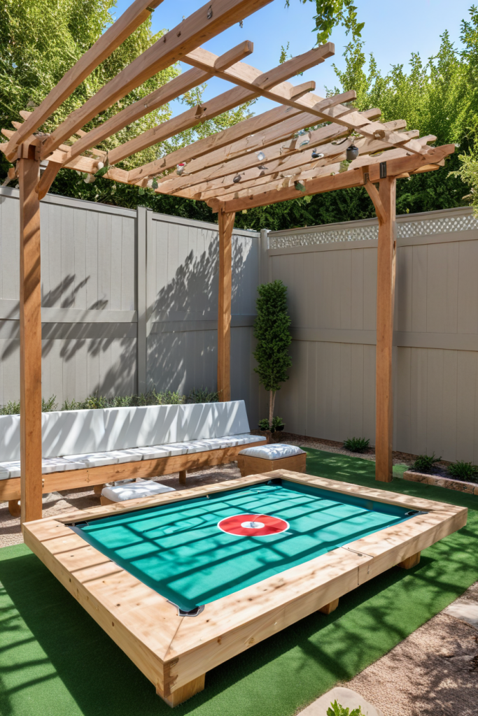 A personal game area increases engagement for guests young or old. Set aside areas for putting, cornhole, or bocce ball. For continued fun, a personalized ping pong or foosball table is a great addition. Take it to the next level by incorporating an LED dart board or a giant Jenga set. Alongside these modern games, ensure everyone stays comfortable by having seating with shade.