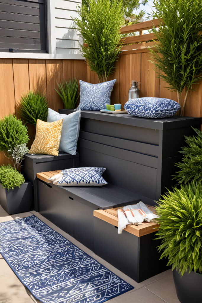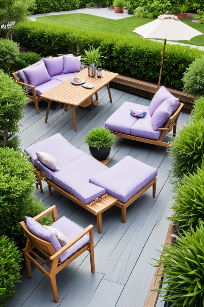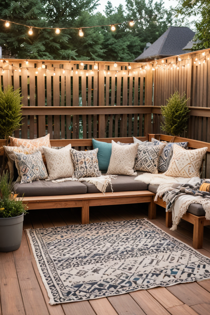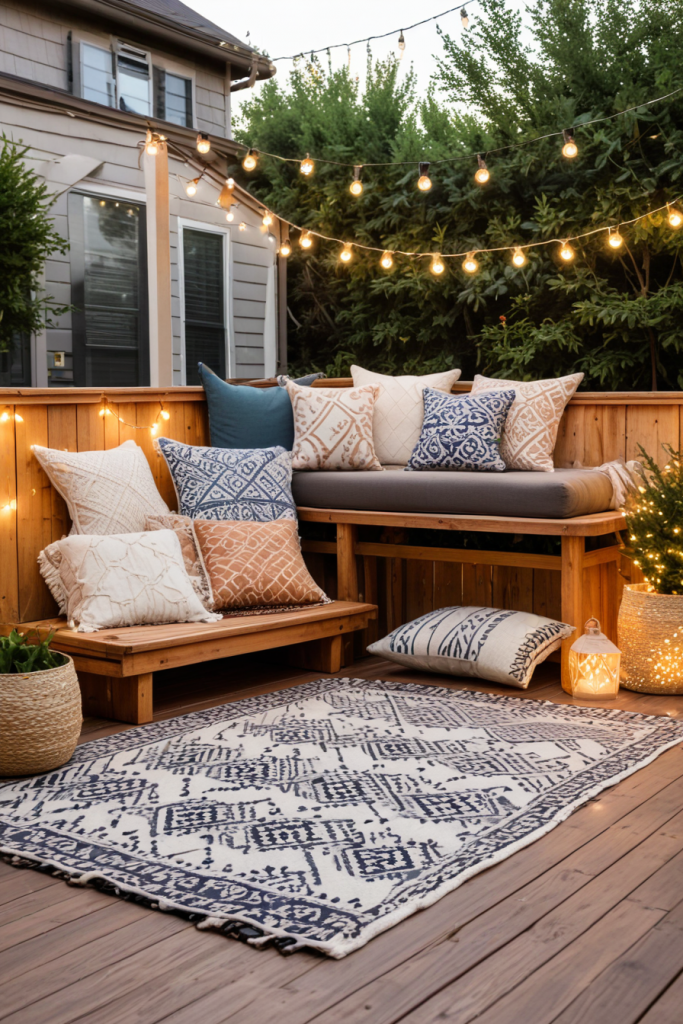 Using rugs and fabrics on the deck makes your backyard more comfortable and visually appealing. Select easy to clean, fade resistant rugs, which will help in defining seating areas. Throw pillows, cozy blankets and outdoor curtains will add extra texture and warmth to the space. For a lively environment choose vibrant patterns, but for a more sophisticated look consider neutral tones. Placing the rug over the wooden deck or stone flooring creates a seamless indoor outdoor feel.