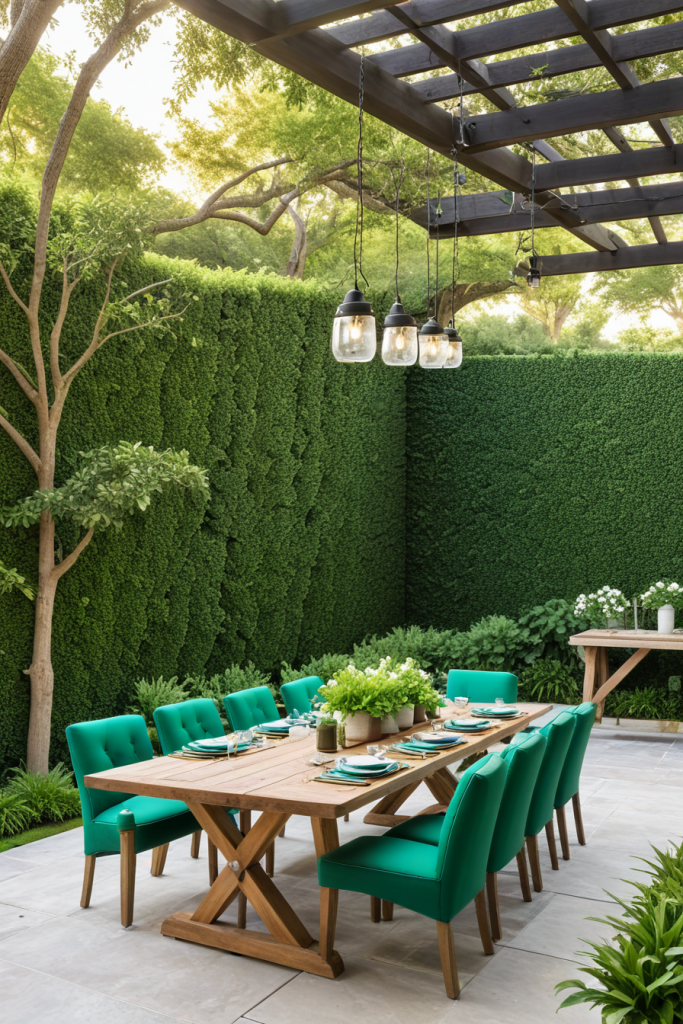 Thick gardens and greenery enhance the beauty of any outdoor space meant for entertainment. Add climbing vines on the pergolas, sculpted hedges for privacy, and patterned grasses for added texture. A structured look can be achieved using potted plants or raised garden beds. A combination of seasonal flowers and evergreen shrubs provide vibrancy throughout the year. For an elegant touch, consider small garden fountains and pathway lights.