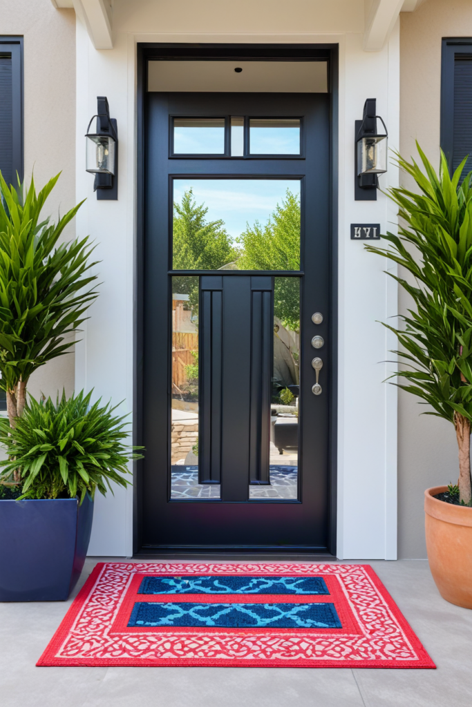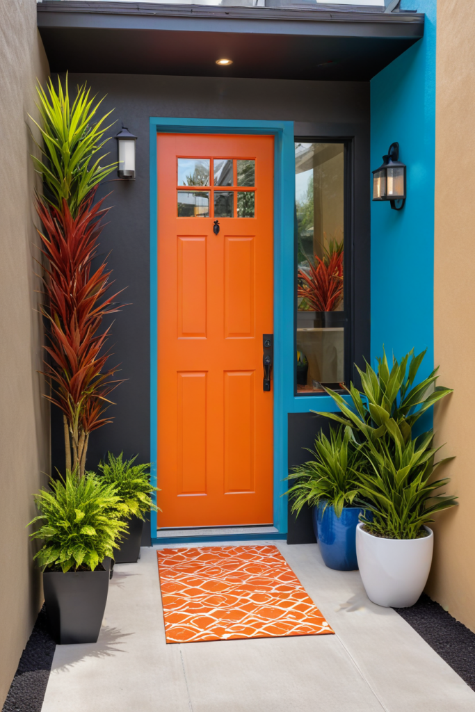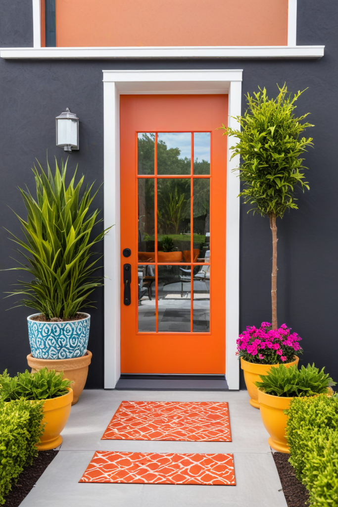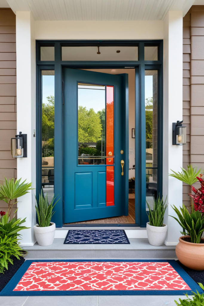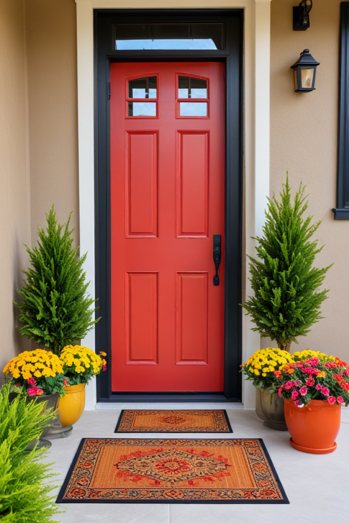 An interesting display set on the front porch together with a sophisticated color palette catches attention immediately. The combination of vibrant colors, stylish door mats, and tasteful accessories creates a focal point. This design type captures the eye in a pleasant manner while deploying a warm inviting tone. Such a cleverly arranged entryway tells a lot about the inhabitants and sets a pleasant mood for the rest of the house.