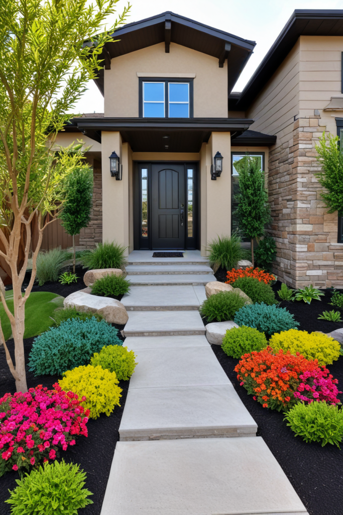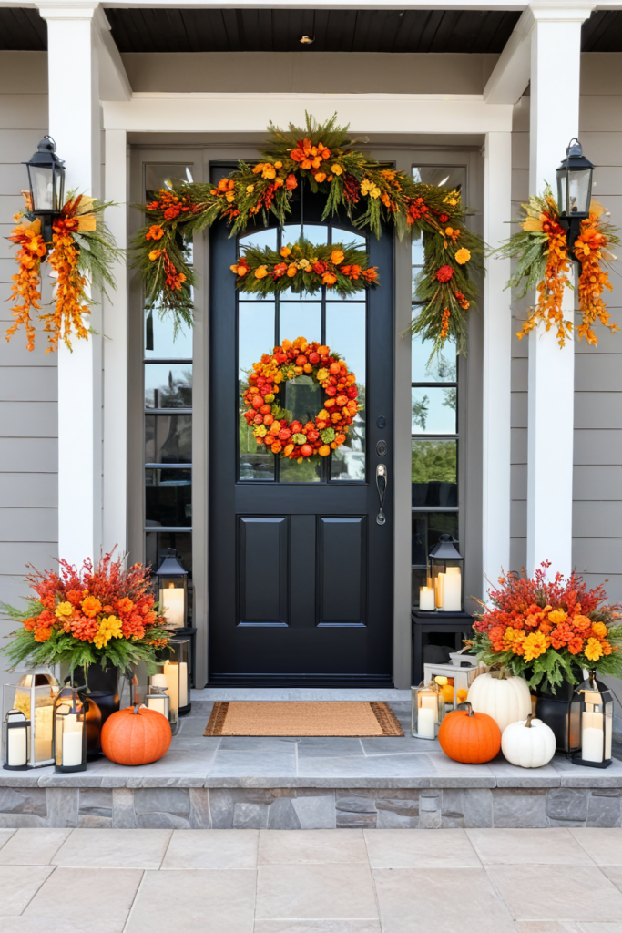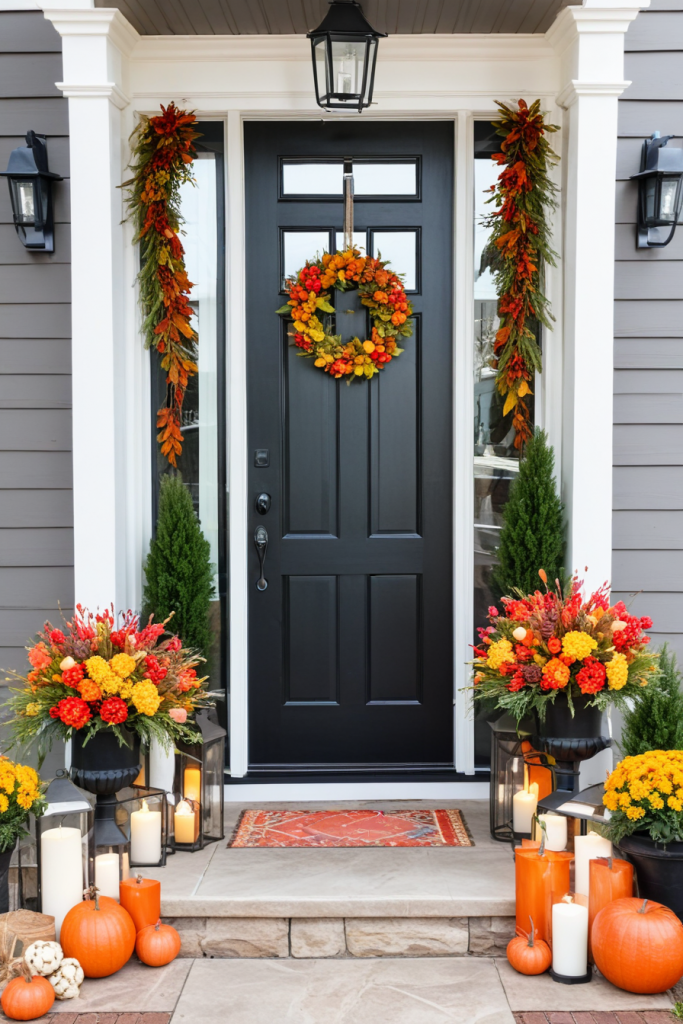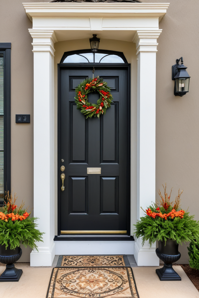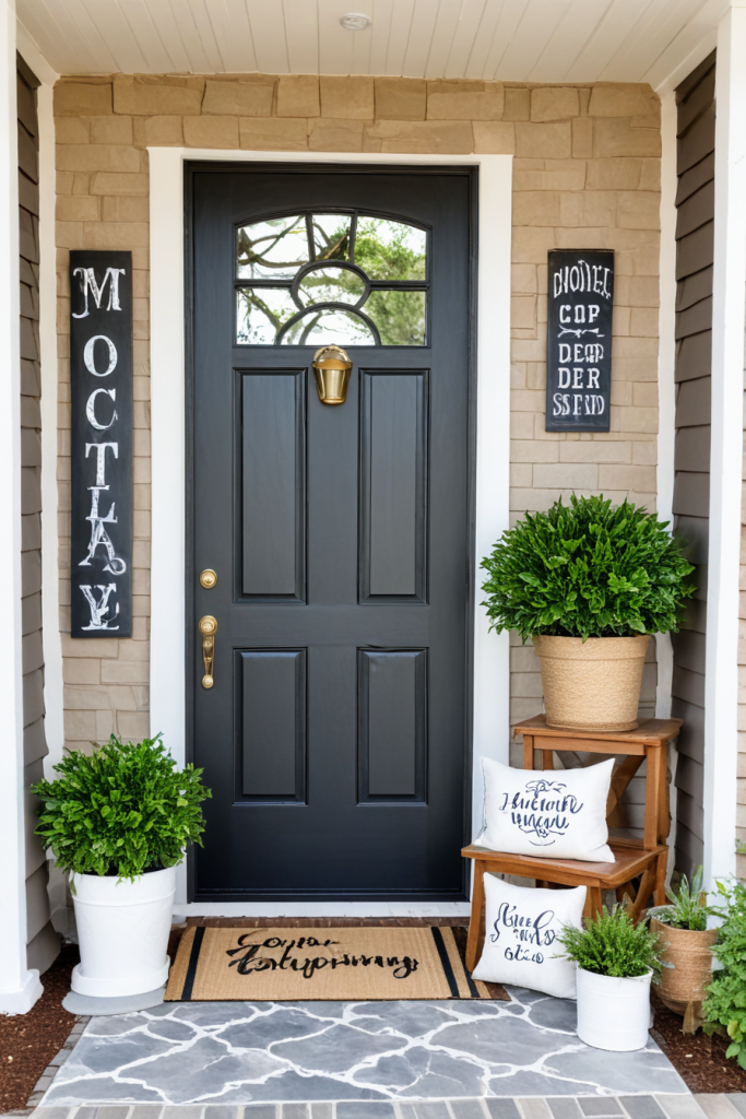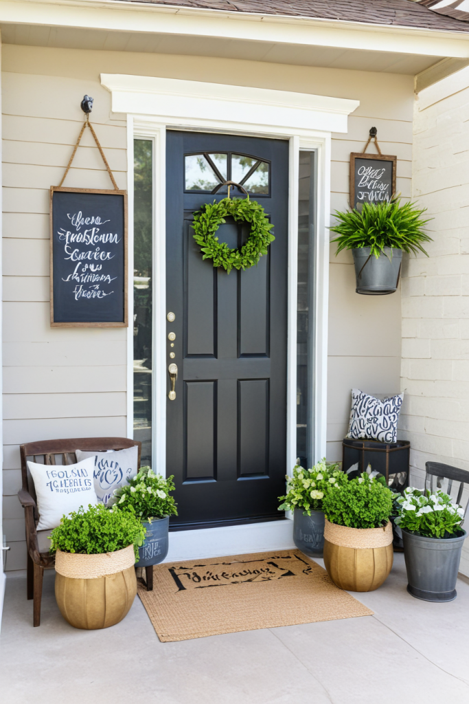 An interesting display set on the front porch together with a sophisticated color palette catches attention immediately. The combination of vibrant colors, stylish door mats, and tasteful accessories creates a focal point. This design type captures the eye in a pleasant manner while deploying a warm inviting tone. Such a cleverly arranged entryway tells a lot about the inhabitants and sets a pleasant mood for the rest of the house.