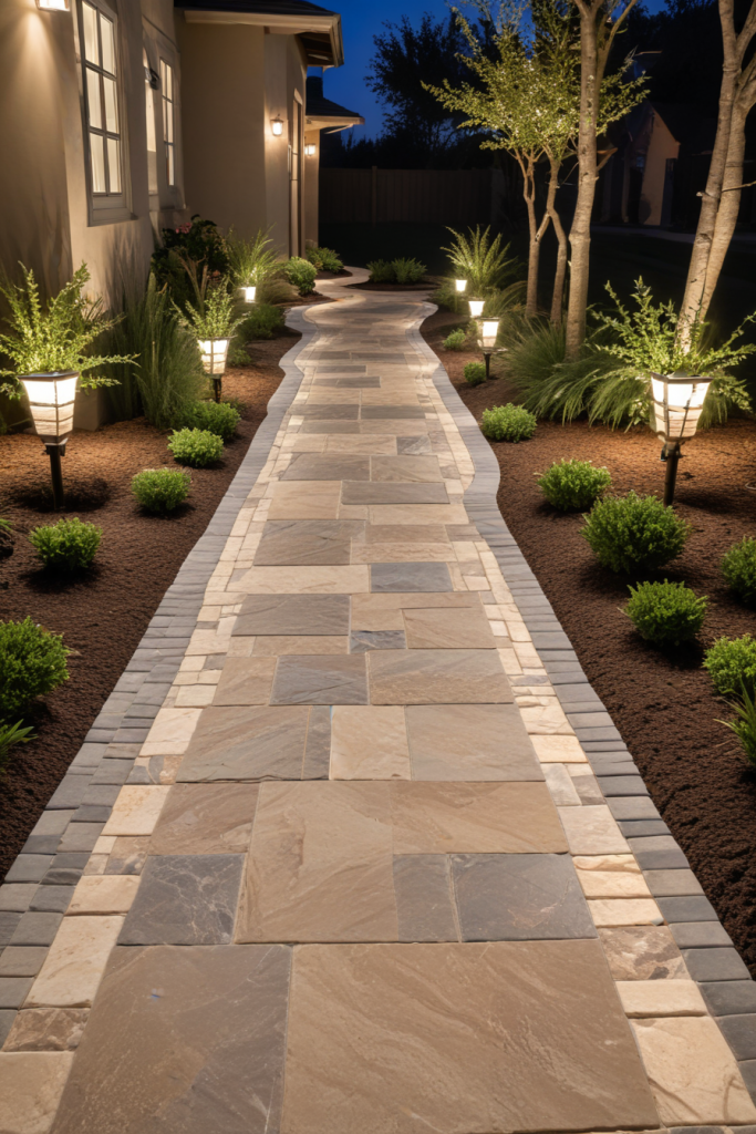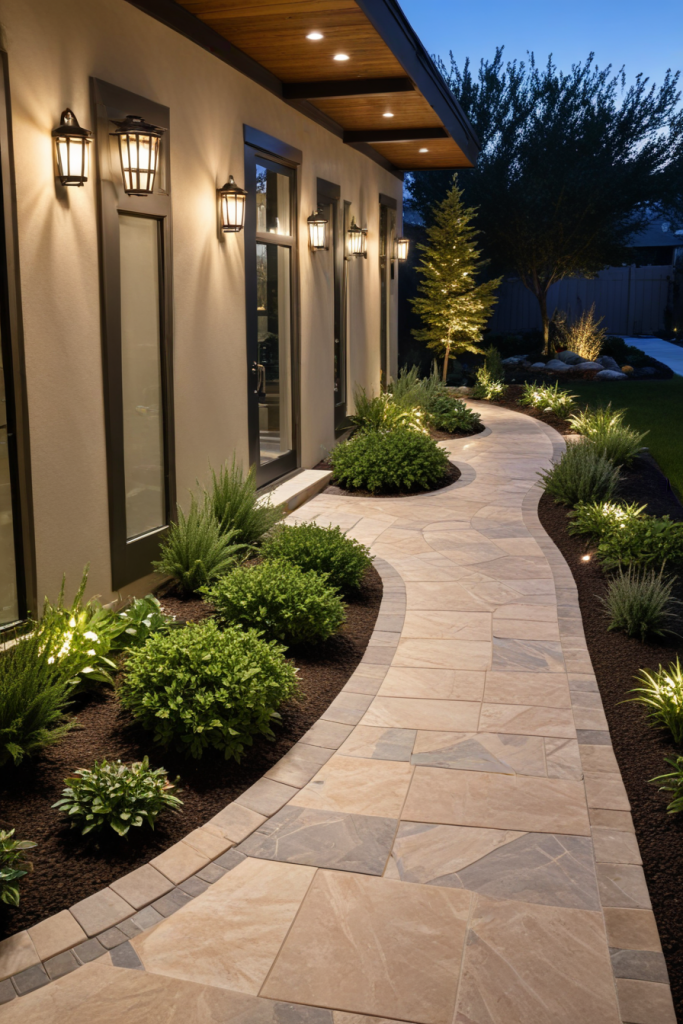 Positioning solar lights or elegant fixtures in carefully chosen areas can create tranquility and warmth in your outdoor walkway, while at the same time ensuring proper lighting. Furthermore, the combination of ambient LED lights and similarly styled solar lighting enhances the overall peace in the surrounding area. His design choice carries an element of sophistication, while light positioning improves efficiency.