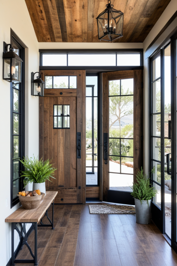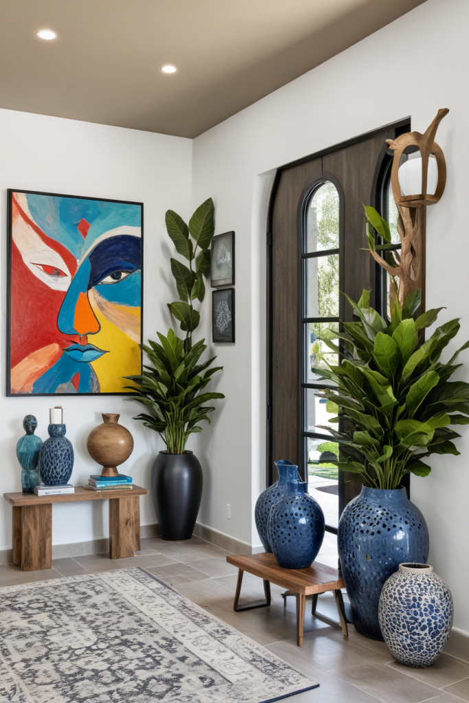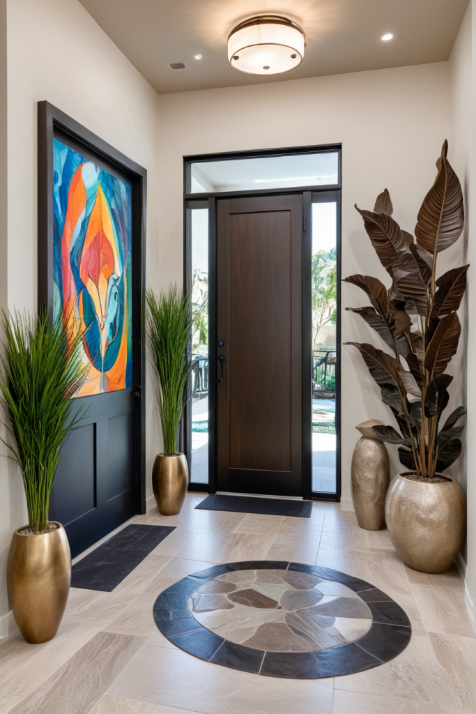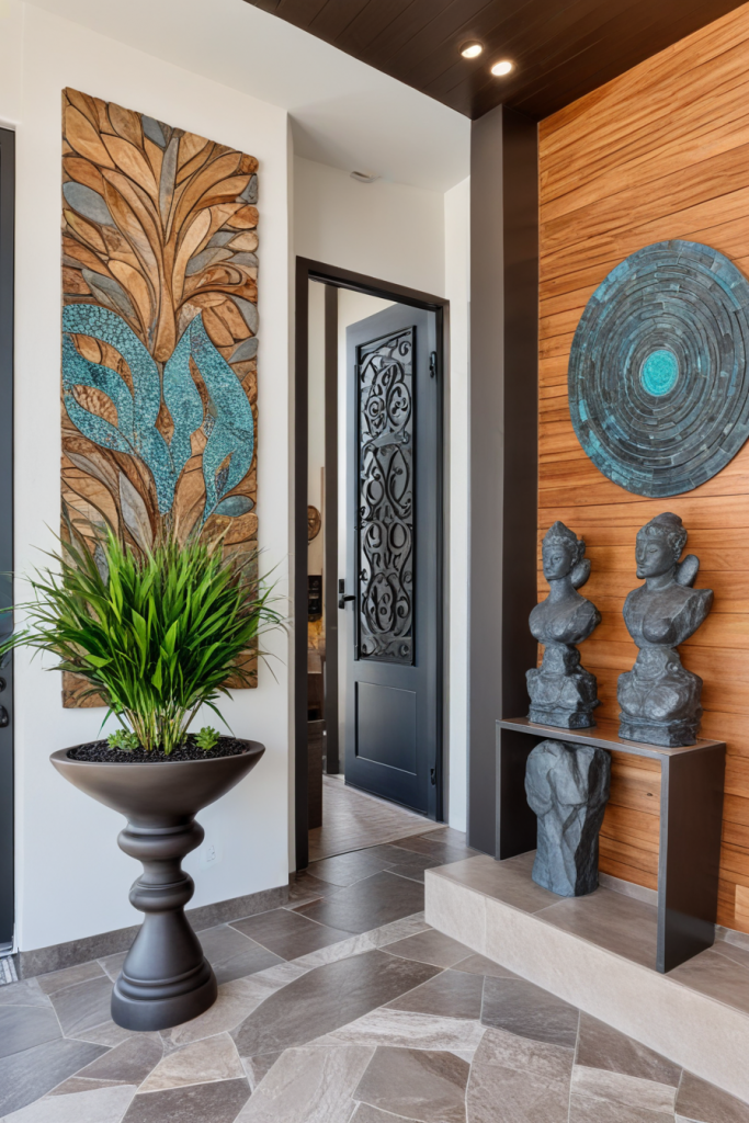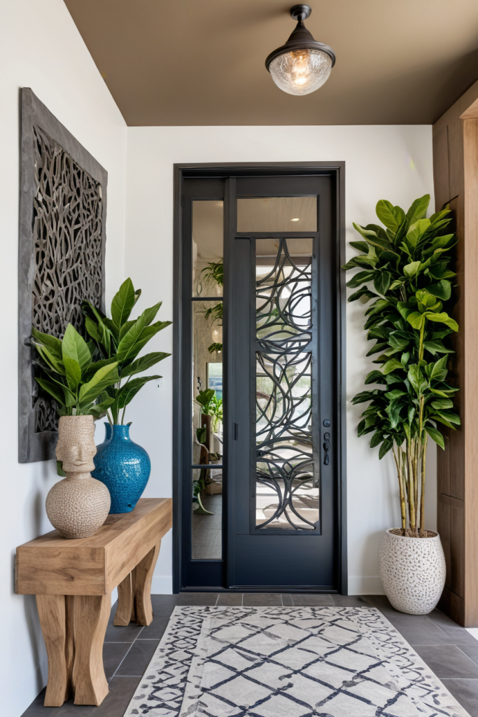 Introducing natural components into your entryway, like wooden chandeliers, stone decorations, and green plants, promotes warmth and serenity. Using this method fosters a relaxed and welcoming environment that highlights sustainable development while still adding interest and dimension to the decor. The touch of nature boosts the aesthetics and the character of the space.