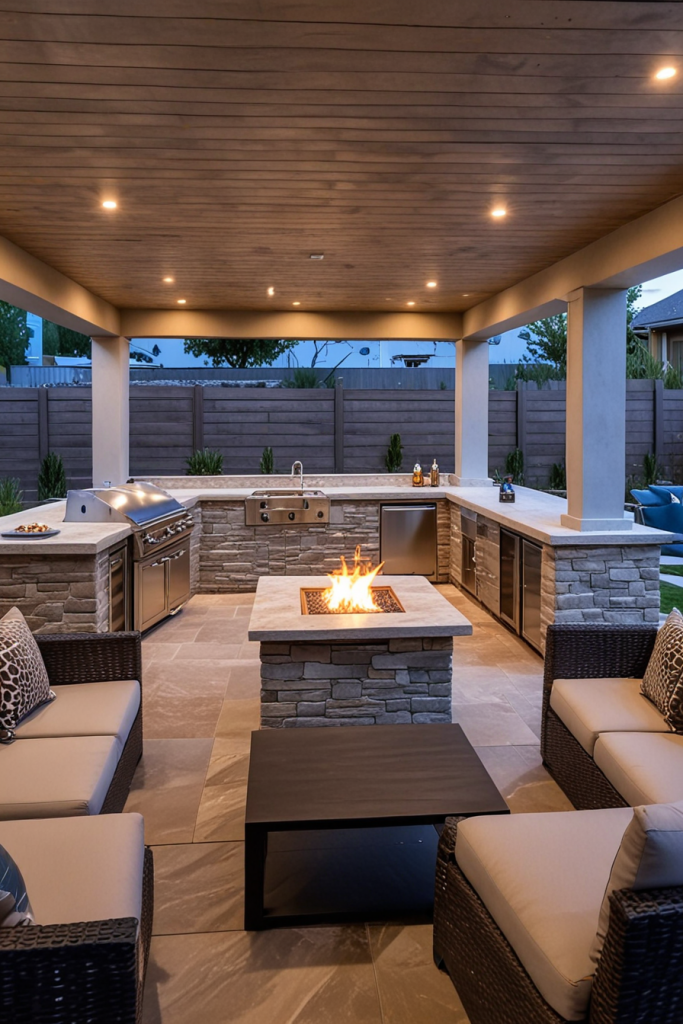 A fire pit can be incorporated into an outdoor kitchen for warmth and elegance. In this case, a stone fire pit is the center of the seating area, which is surrounded by a U-shaped bar counter that effortlessly encourages socialization. Meanwhile, the textured concrete countertops and reclaimed wood elements provide the contrast, while the recessed lighting picks up on the outlines of the overall design. It is this fire pit that makes cozy evenings under the stars a perfect time.
