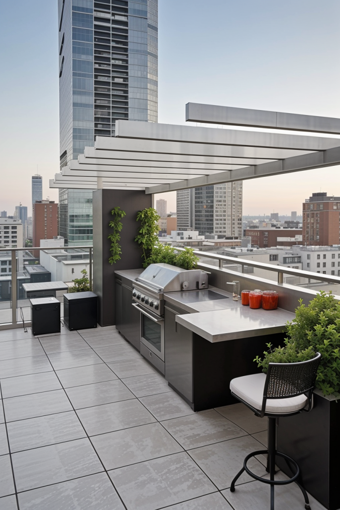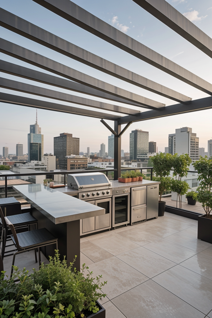 Rooftop outdoor kitchens have been thought to offer great views along with a stylish and functional design. Culmination of a compact yet fully equipped kitchen station, chic bar seating, and dig metal railings for an open feel is the rest of the space. The flooring, tiles in large-format alongside, and a retractable pergola mechanism are some of the features that can guard against the bad weather.