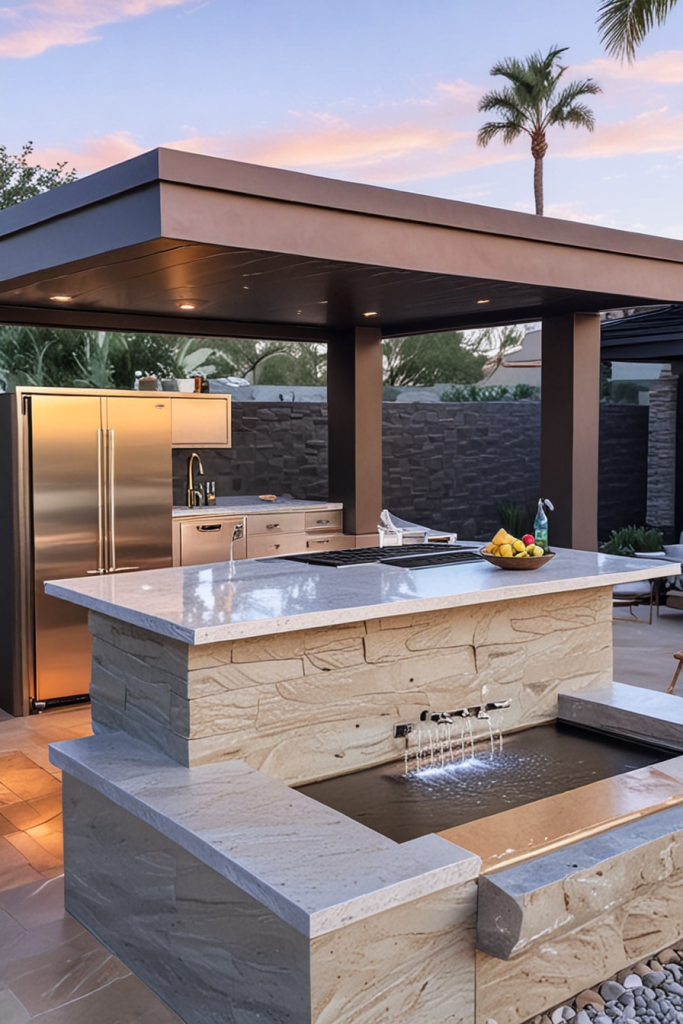 Outdoor Kitchen and Bar with a Sleek Waterfall Countertop