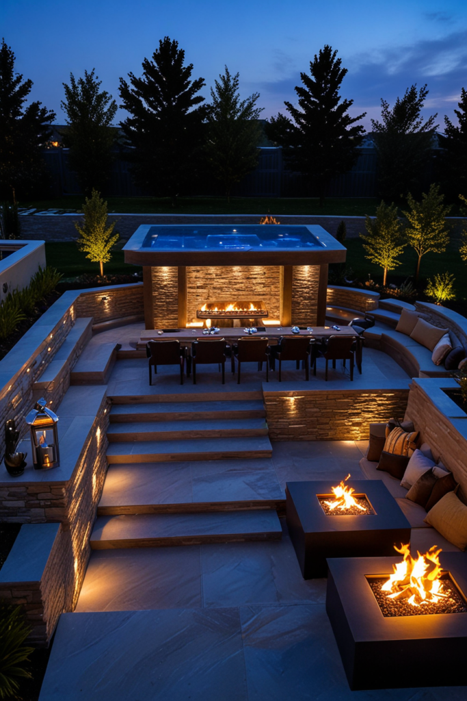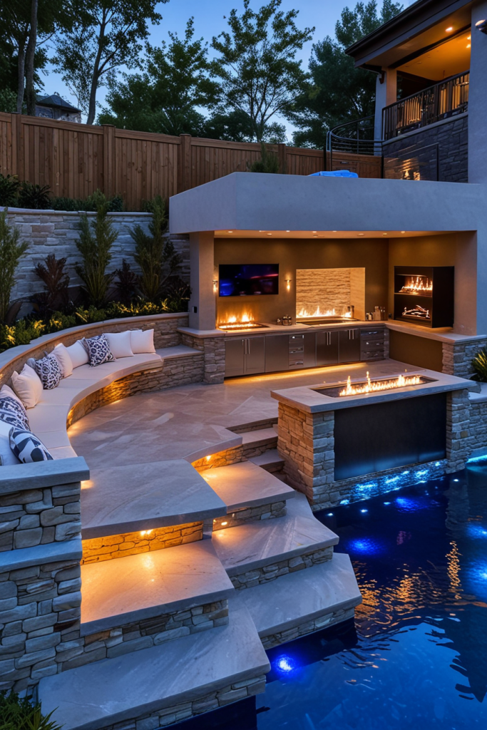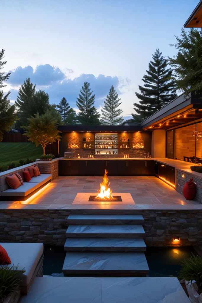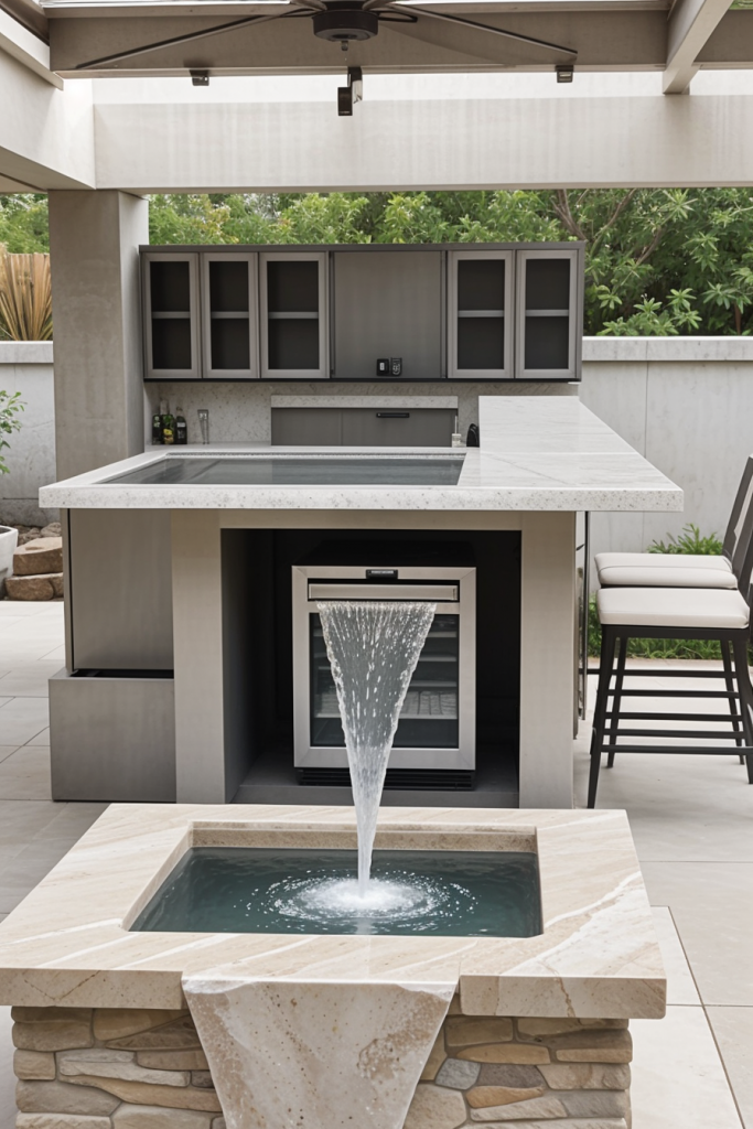 Blending a sleek design made of high-quality materials makes the outdoor kitchen and bar, so the space is as luxurious as it is practical. Just picture yourself using those thin countertops, high-tech grills, refrigeration space already built in with light settings to allow you to chill. A big part of the look is the tiles in large format or exactly materials for the deck without a joint, providing you with the elegance of stone and steel. The personalized touches include decorative bar stools, pendant lighting, and the water feature which added the luxurious mood to the room.