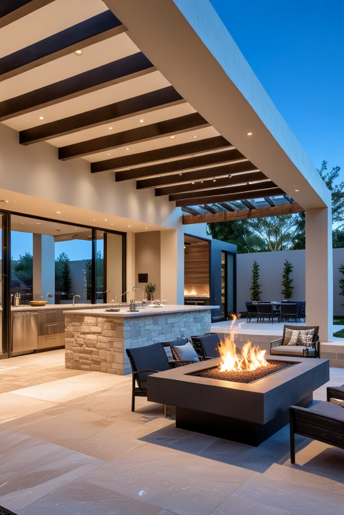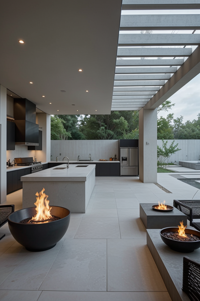 Outdoor Kitchens with a Contemporary Fire Pit Integration