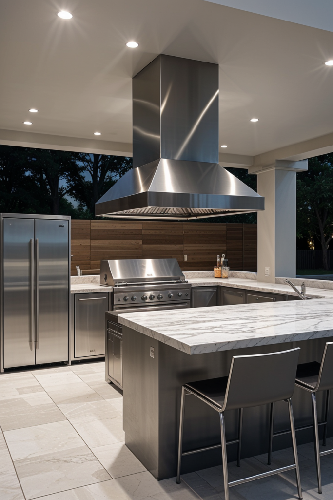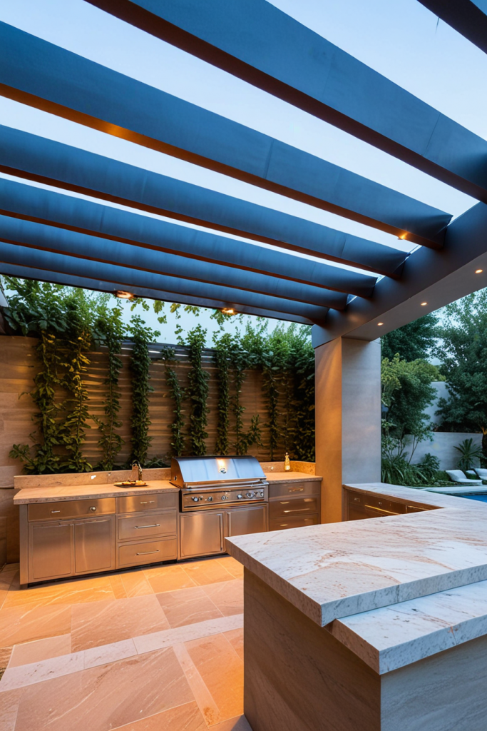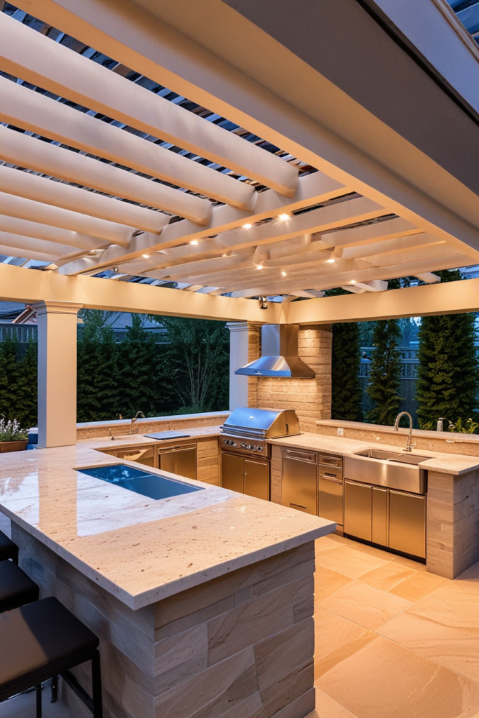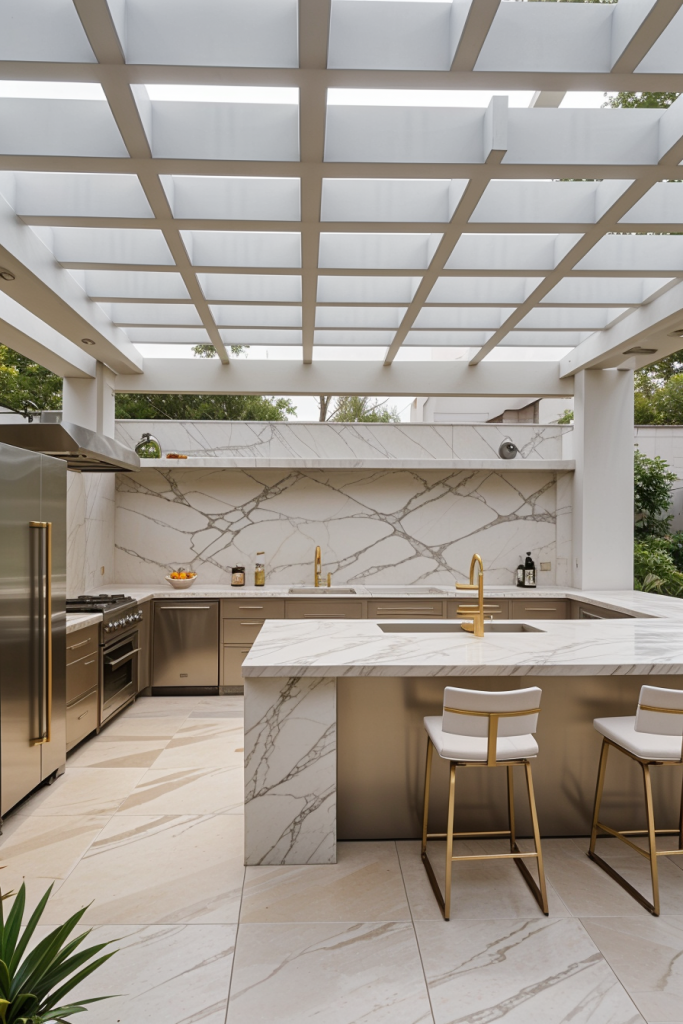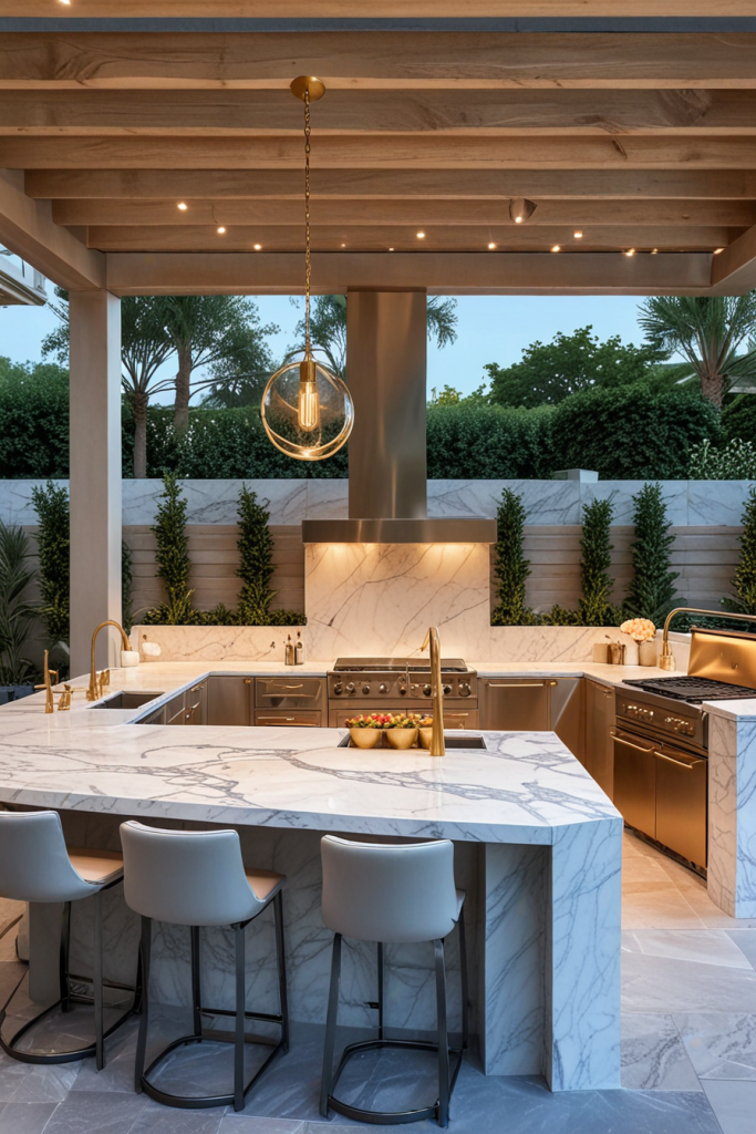 Made of marble something like an open-air kitchen would be the very option for exclusive entertainment. The layout comes with a whole marble countertop and backsplash, made of which are custom-built stainless steel cabinets for a smooth contrast. A central island as a stand-alone constructed with waterfall edges, gold or brass fixtures, and high-end appliances increases this space’s clout. Pieces of furniture such as designer barstools, sculptural lighting, along with the sleek overhead pergola are the elements that complete the area.