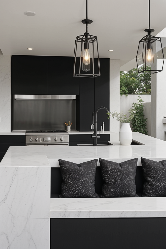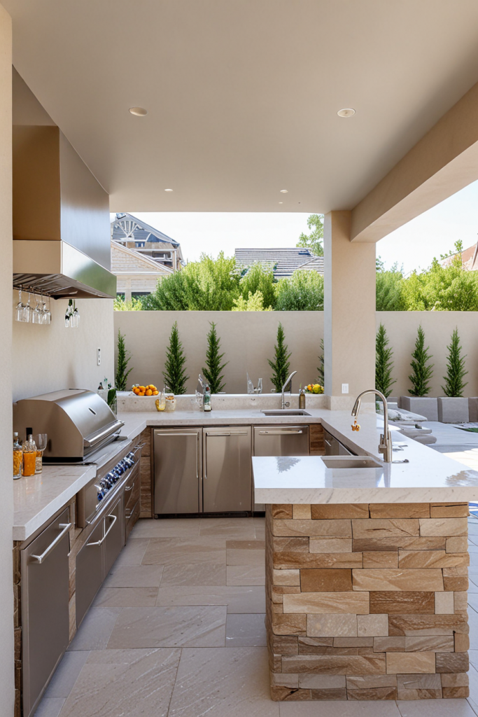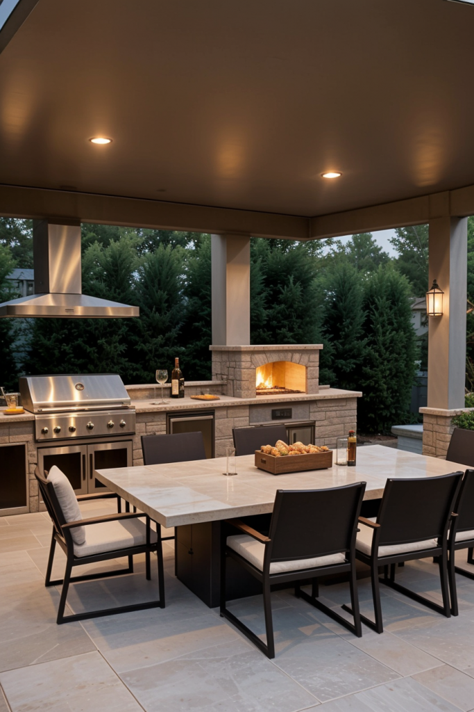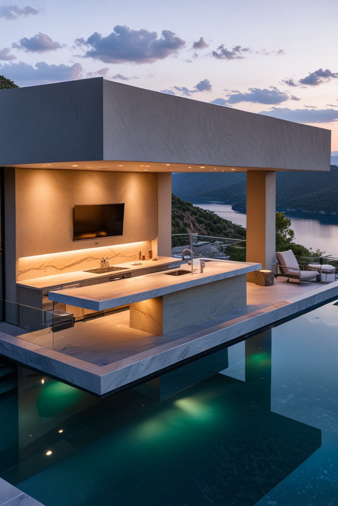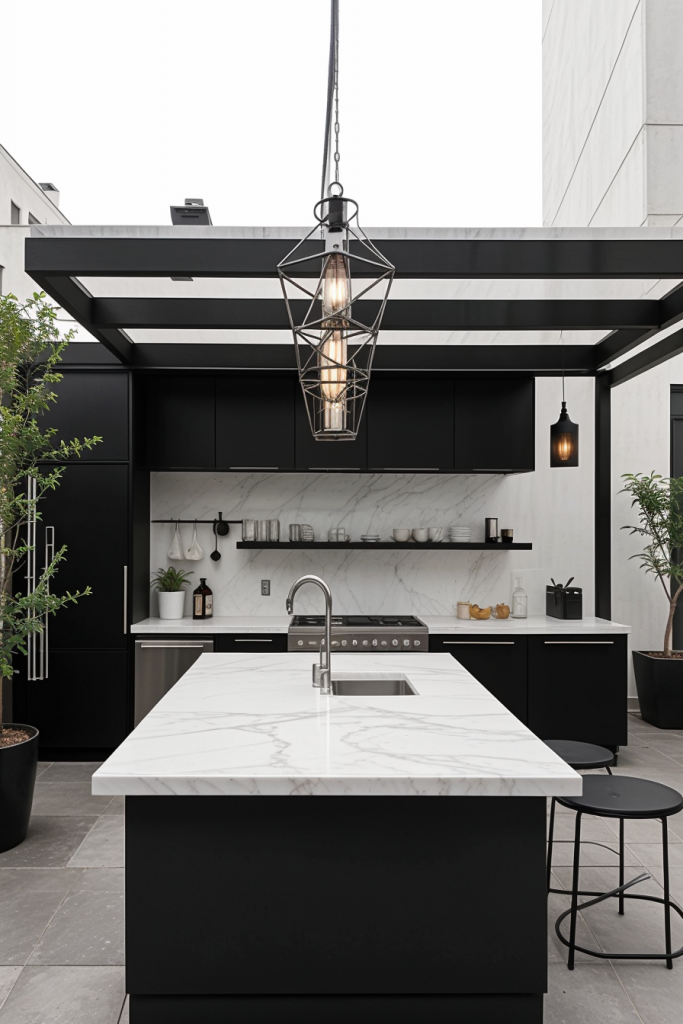 Made of marble something like an open-air kitchen would be the very option for exclusive entertainment. The layout comes with a whole marble countertop and backsplash, made of which are custom-built stainless steel cabinets for a smooth contrast. A central island as a stand-alone constructed with waterfall edges, gold or brass fixtures, and high-end appliances increases this space’s clout. Pieces of furniture such as designer barstools, sculptural lighting, along with the sleek overhead pergola are the elements that complete the area.